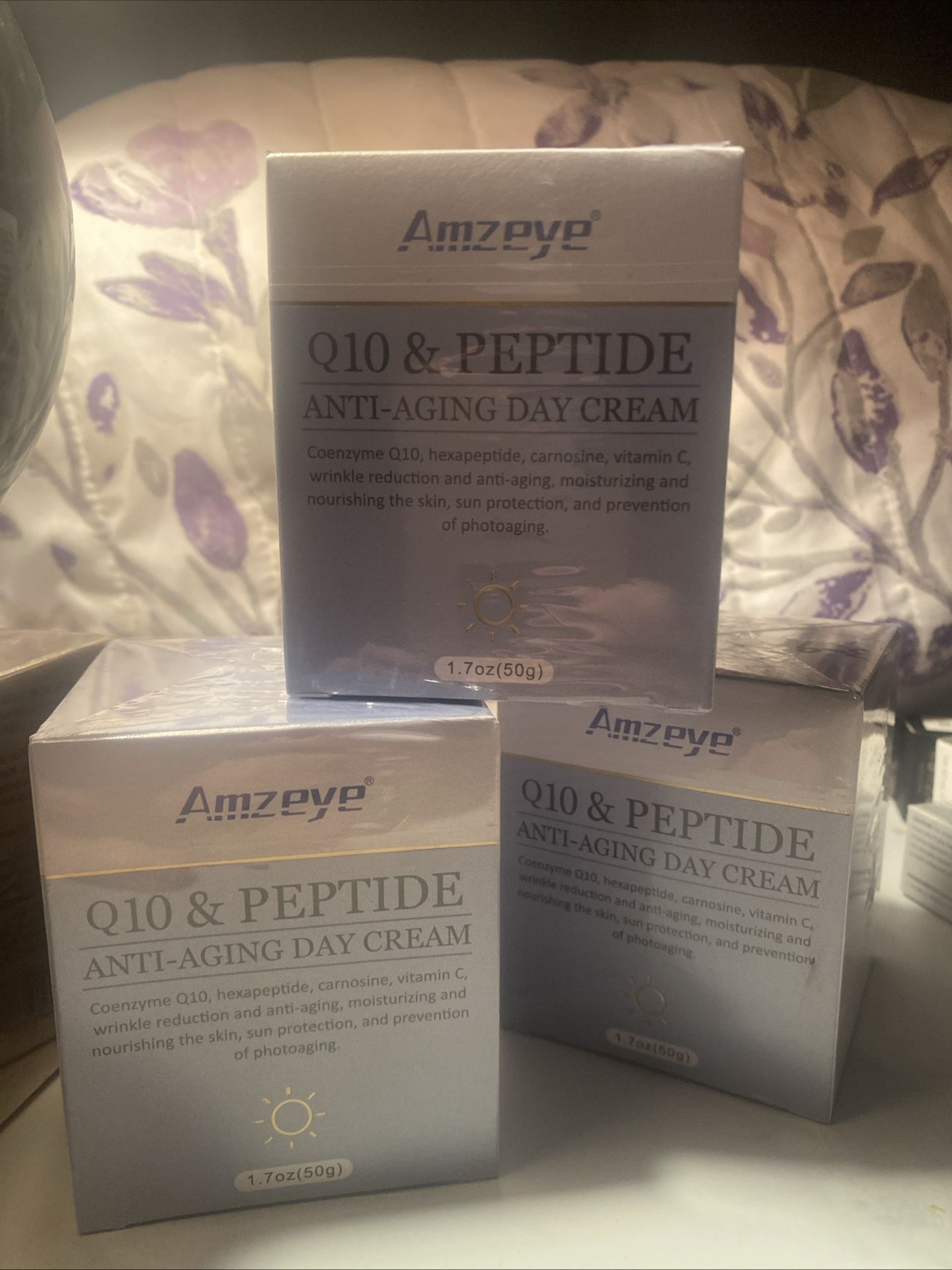 This is Amzeye Q10 & Peptide Anti-Aging Day Cream. Formulated with Coenzyme Q10, hexapeptide, carnosine, and vitamin C. Aims to reduce wrinkles and provide anti-aging benefits. Offers moisturizing and nourishing properties for the skin. Includes sun protection and helps prevent photoaging. Cellular Energy: Q10 helps skin cells produce energy, aiding in repair and regeneration. Collagen & Elastin: Peptides and Q10 support the production of these vital proteins, improving skin structure. Antioxidant Protection: Helps neutralize free radicals that cause skin aging. Hydration & Smoothing: Oils and butters provide moisture and smooth the skin's surface, minimizing wrinkle appearance. still sealed never opened