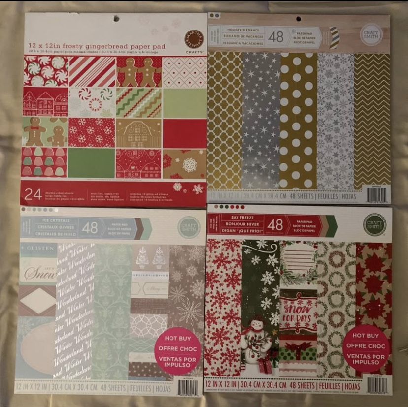 $25 cash Firm for all 4 Christmas 12”x12” paper pads. New quality paper pads are cardstock thickness. 1 Martha Stewart brand double sided prints, 3 Craft Smart brand single sided prints. Some have metallic or glitter specialty pages. Meet in Huntington Beach only, No shipping. Serious buyers only please message