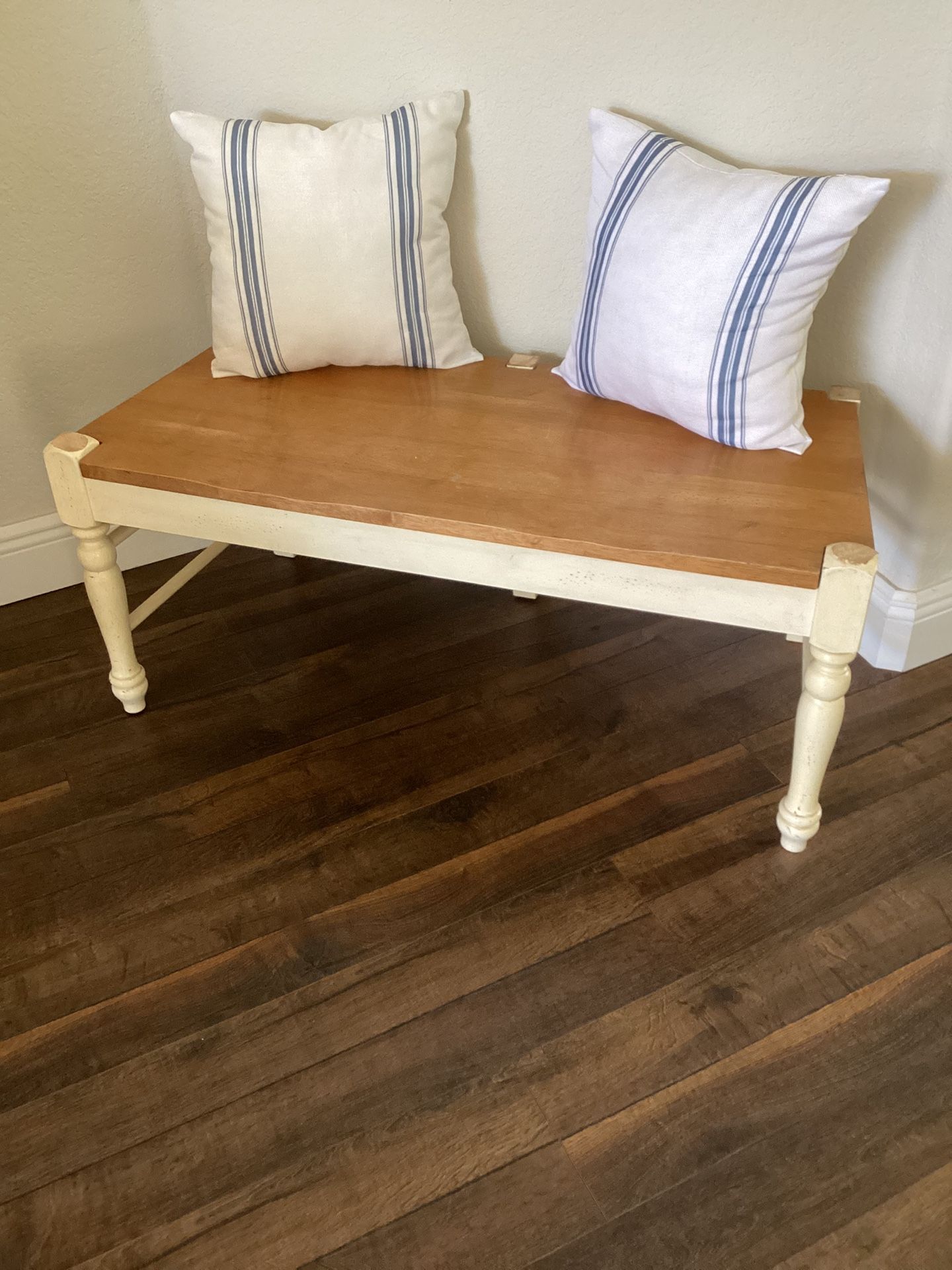 Wood bench measuring 16.5 inches tall by 39 inches long by 18 inches deep. Legs are cream and top is a light, honey colored wood. Bench is slightly narrower towards the back. Top has inverted areas where one would sit. Refer to photos. Had a flat long cushion on top but I no longer have. Bench could be painted and you could add your own pillows or a bench cushion on top. Cute farmhouse look. Perfect for a hallway or mud room or as a little garden seating in a covered area. Needs a little TLC. Strong, and sturdy bench. Pillows aren’t included