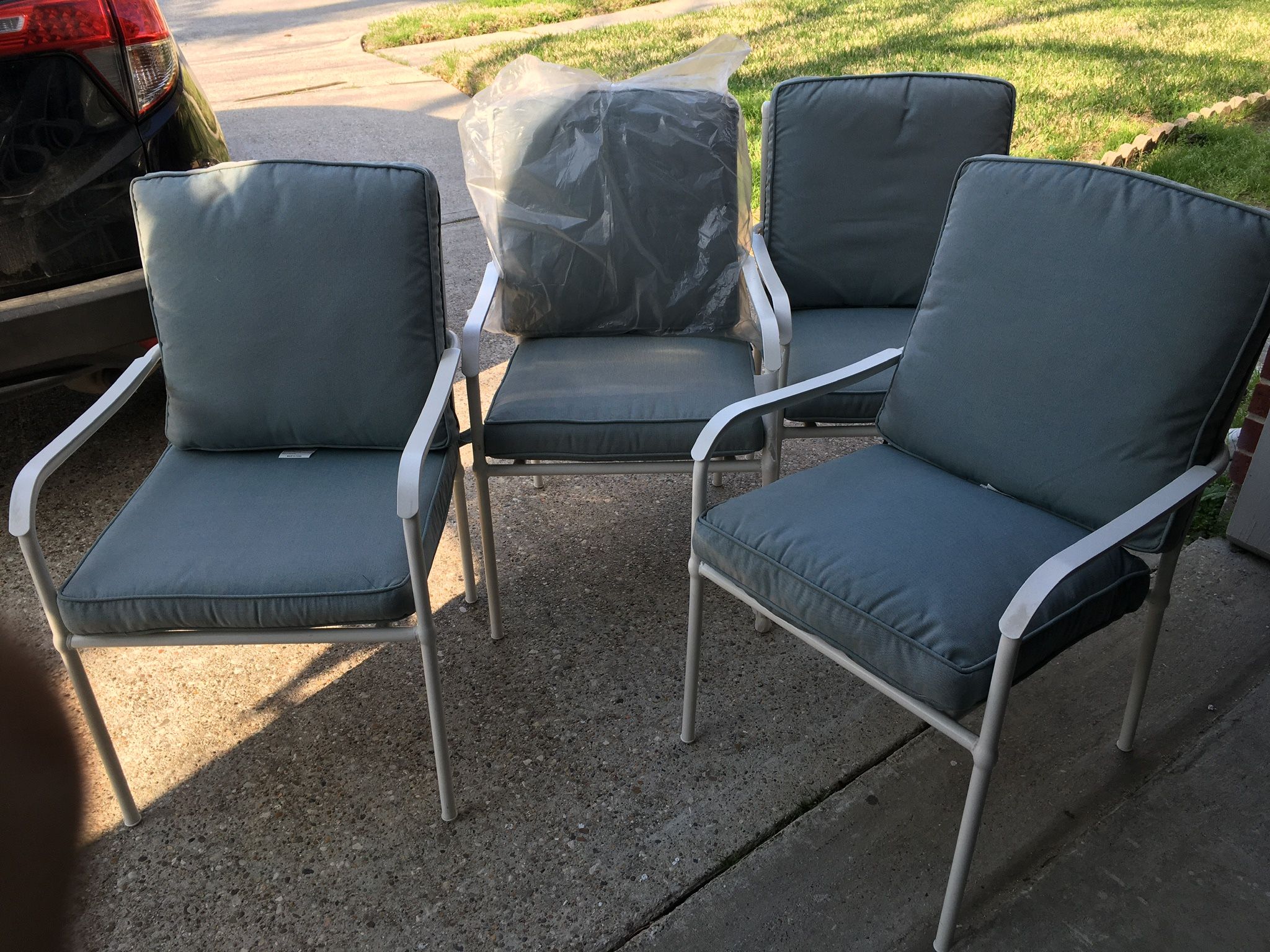 New. Style Selections Seacrest Set of 4 White Steel Frame Stationary Dining Chair with Blue Cushioned Seat $250.00 O’B’O’