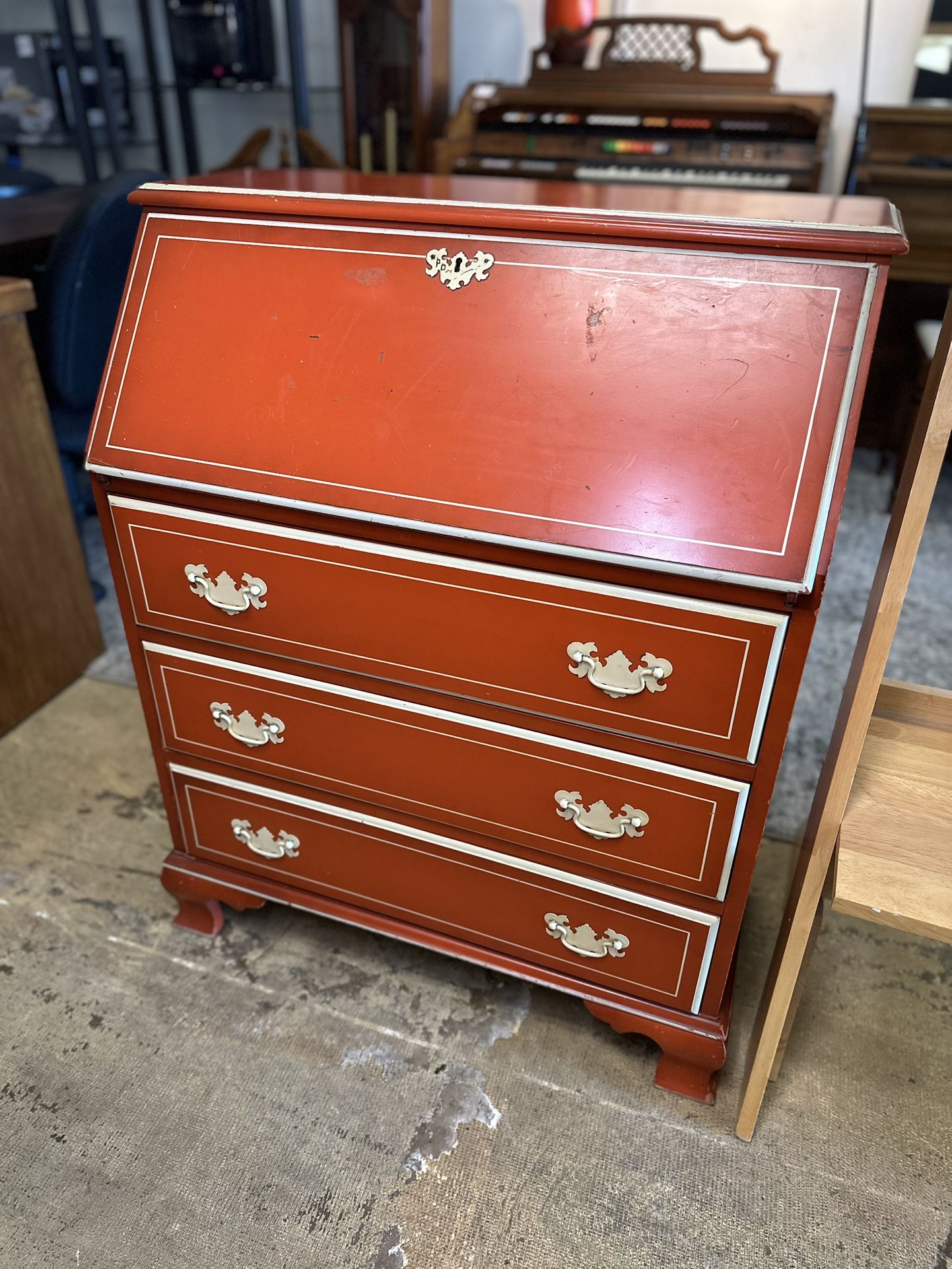 Charming orange-red drop front secretary desk. Has cool white pinstripe details and gold hardware. Drop front opens to reveal cubbies and a small drawer inside. Plus three more drawers below for storage. Great piece for a home office or a cozy corner. Visit Market Me Resale- where we have quality is used furniture, antiques, decor collectibles, and more. Located right next-door to Bronstein Auction Co in Longwood, FL. Here’s our address: 700 S US Hwy 17 92 Longwood Fl 32750. Hours: Mon-Wednesday 10 am-6 pm Thurs-Sat 10 am - 4 pm Closed Sunday