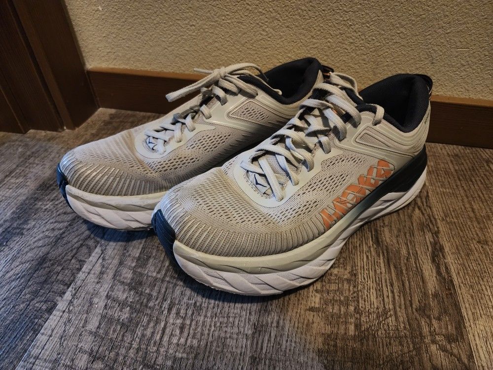 Hoka One Bondi 7 Running Shoes with powerstep insoles. The shoes are in good condition but are a little dirty in some spots, while the insoles are beat up. I think it is size 9.5 womens.