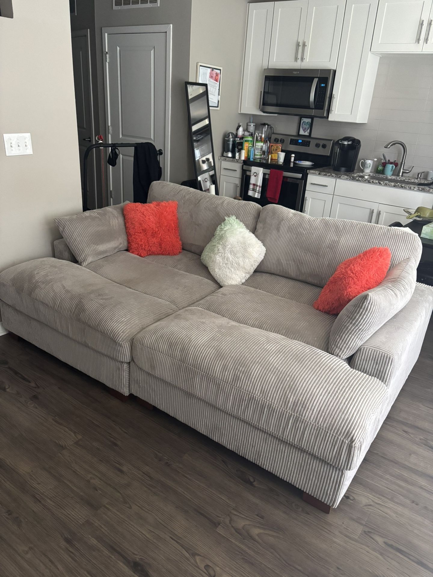 Comfortable lounging sofa, gray for watching TV playing video games. It’s only seven months old. I’m looking to get something larger.