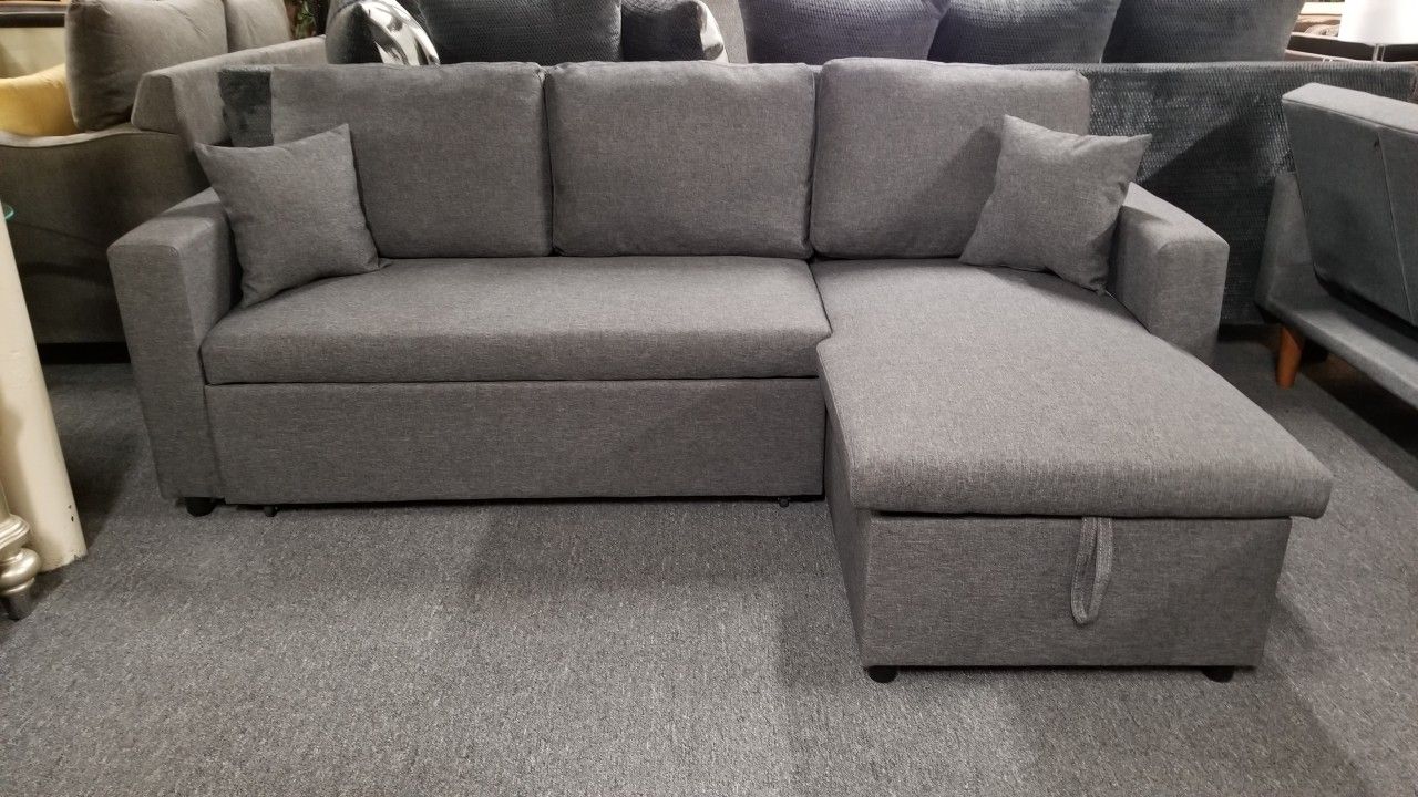 Brand New 99" x 61" Gray Linen Reversible Sectional With Pullout Bed And Storage Chaise