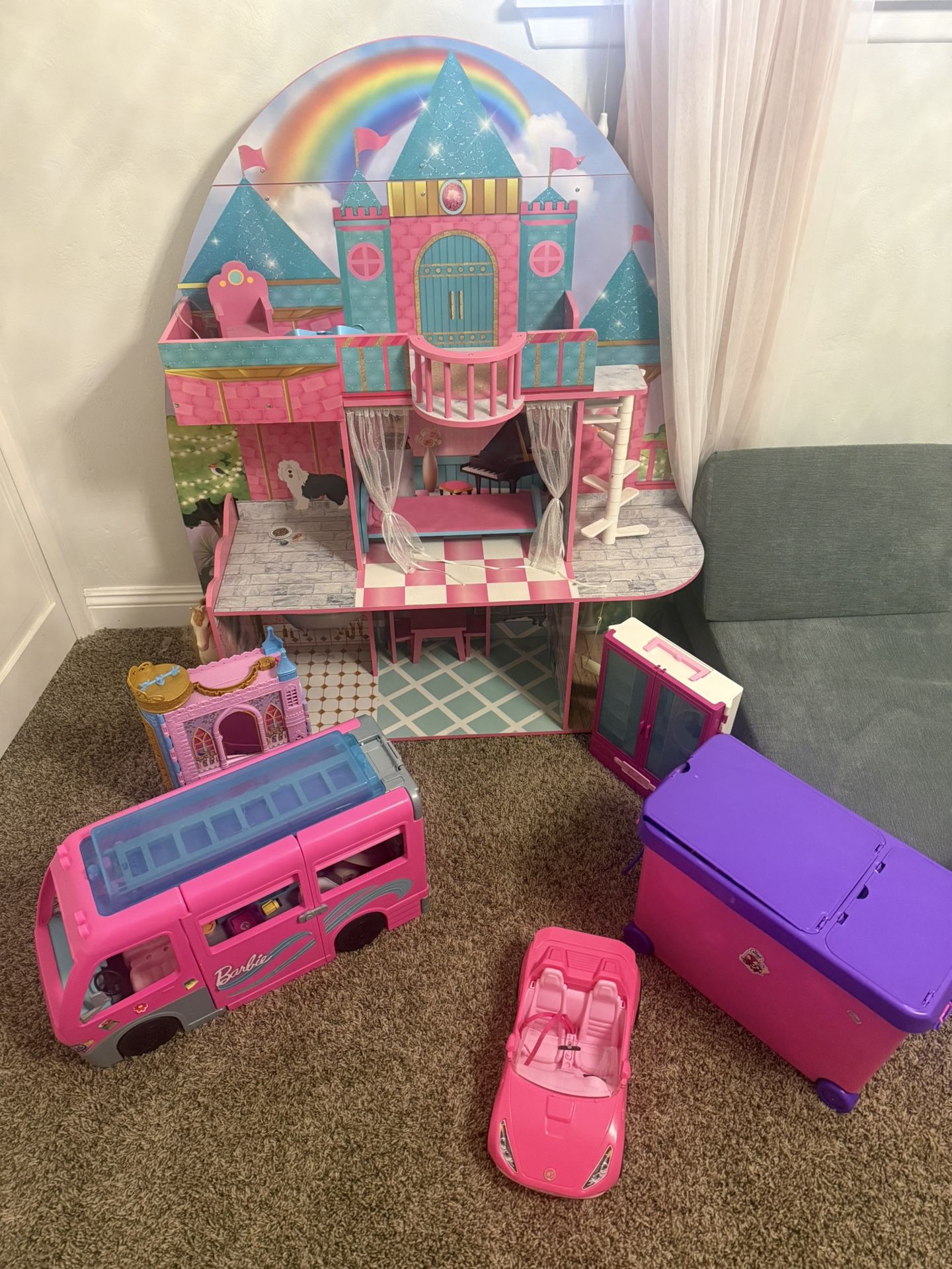 Doll house, Barbie camper, Barbie convertible car, Barbie princess closet, barbie regular closet, Barbie rolling storage filled complete with Barbie’s and Barbie’s little accessories, 2 new single Barbie’s and Barbie horse