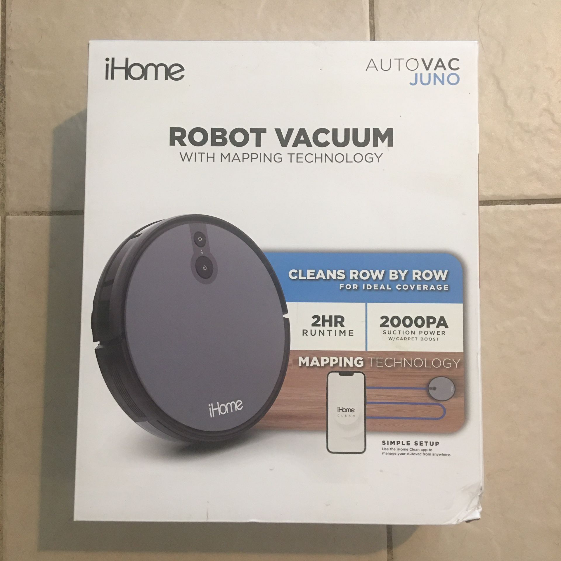 Like new works great used only once. Decided to buy a big one. iHome AutoVac Juno Robot Vacuum, Mapping Technology, Strong Suction, App + Remote Control, 2000pa Suction Power, Cleans Row by Row, Wi-Fi enabled, Cleans carpets and hard floors, One touch control.