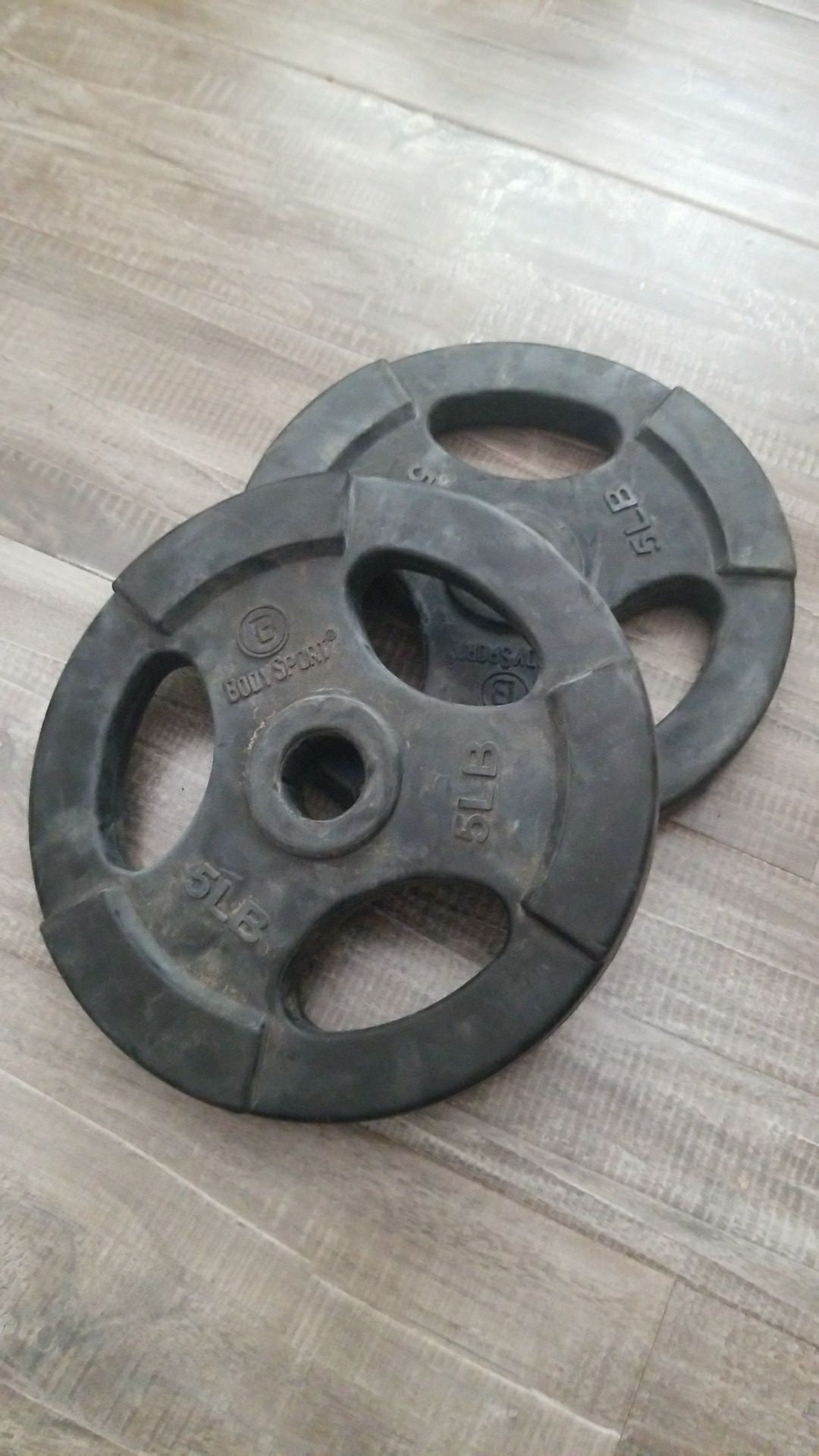 Pair of BodySport 5 lb. Rubber Coated Plates for 1" Standard Barbells, Dumbbells, or Curl Bars. Not for Olympic 2" Collar bars. Commercial Quality and and excellent condition(just a little dusty). These are also nice to put as the outermost weight on your bar to keep the plates from rattling as much. Price is per pair. Only 2 pairs left!