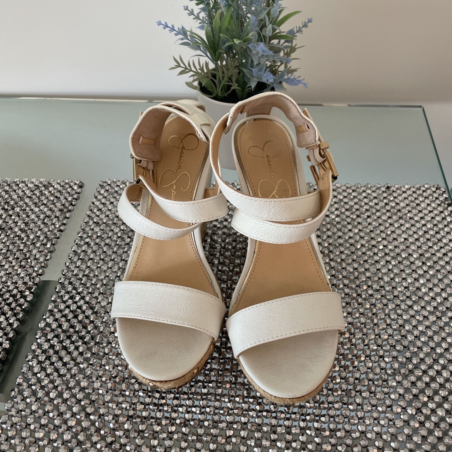 Jessica Simpson white wedges size 8.5. In Good Condition. Shoes are clean. Straps around the ankle. No flaws.