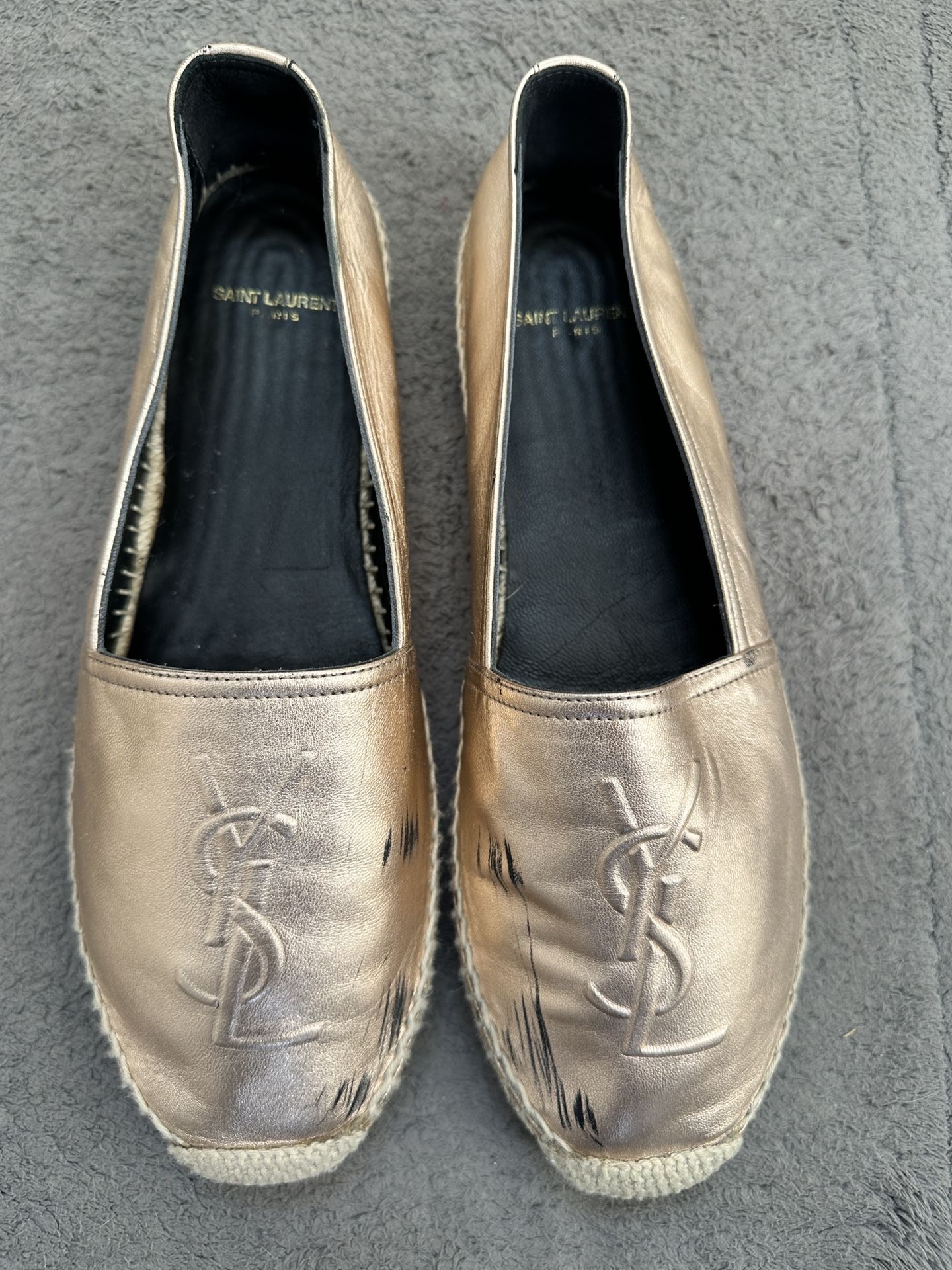 Size 39 Yves Saint Laurent, Rose Gold color flats. Authentic, no box, used. A few scrapes but definately still leave an impact. Retail is $420. These are fairly used however and i want to get rid of them. $50 firm price.