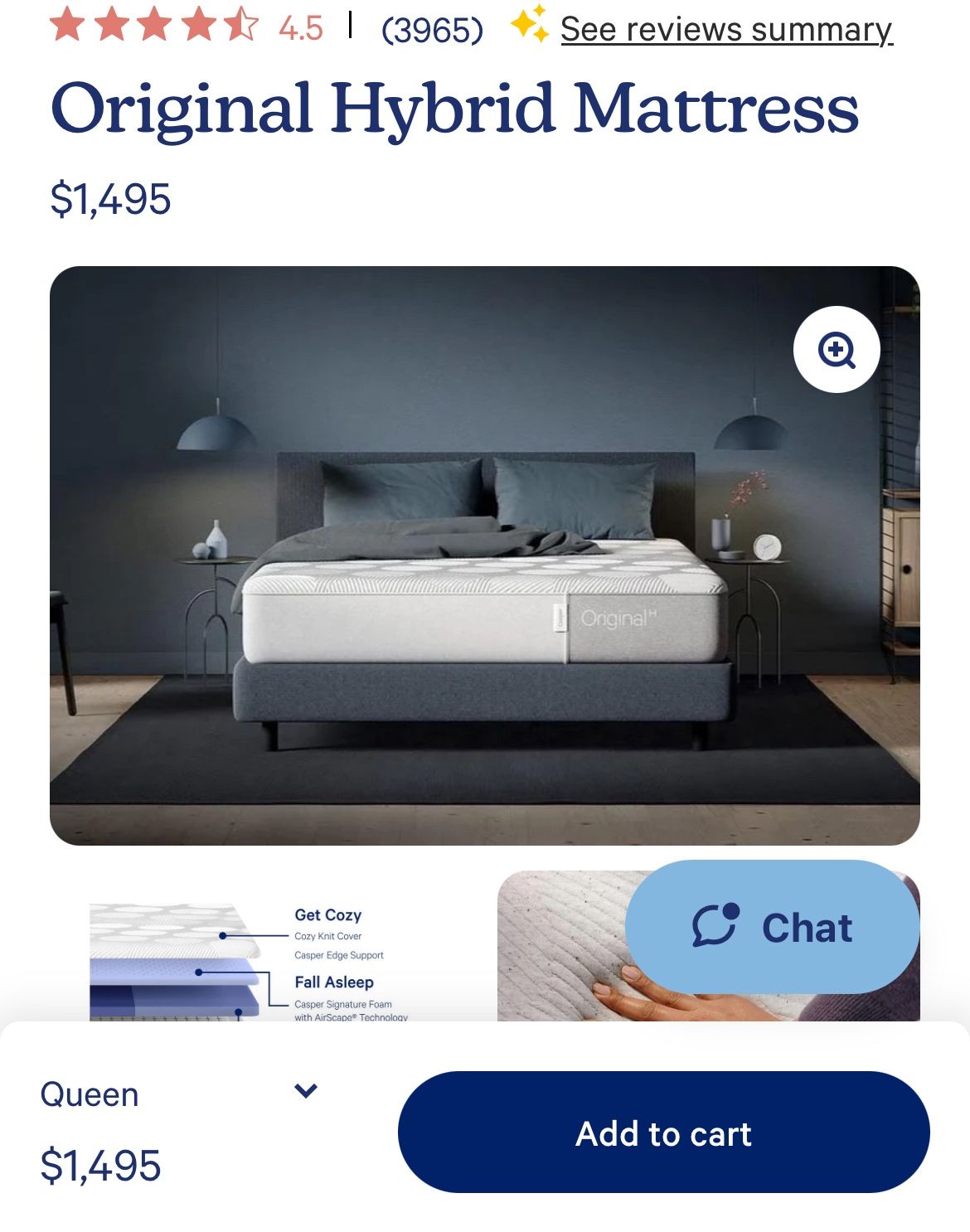 Casper Signature Foam with AirScape® Technology increases airflow and soothes you to sleep. Zoned Support uses 3 ergonomic zones to provide support and spinal alignment. Hybrid Technology pairs springs and foam for the perfect balance of comfort and support.