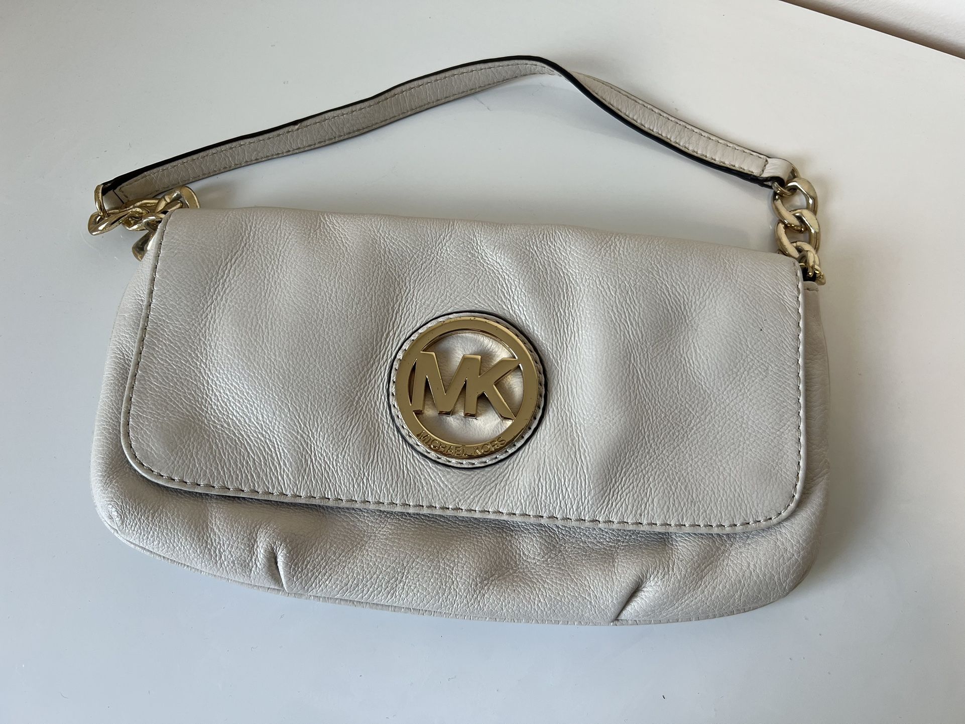 Michael Kors Fulton Chain Link Flap Baguette bag featuring cream