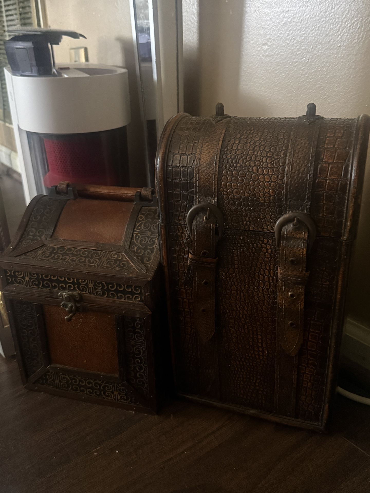Beautiful decorative boxes the taller one with the straps has a removable divider inside. Pretty storage boxes
