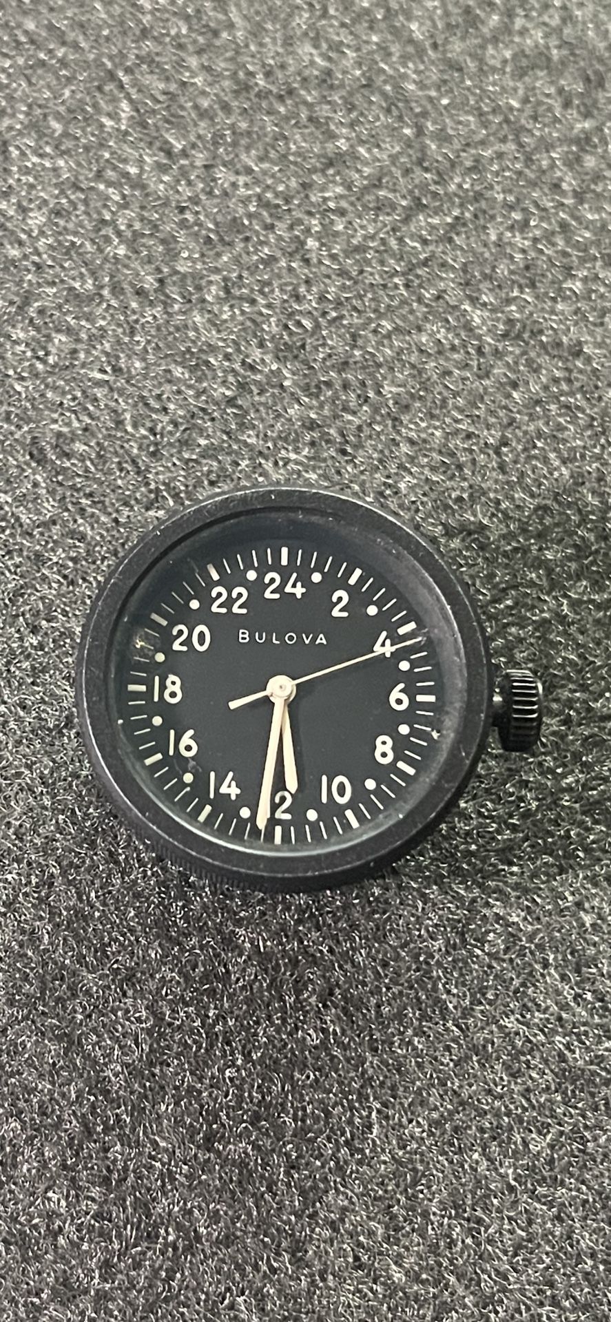 Bulova 24 hour mechanical clock designed for time stamping military surveillance photographs taken from aircrafts. Clocks were mounted inside cameras Utilizing a prism system which would superimpose the clock face acknowledging the time the photo was taken. This clock features an external crown for manual winding. Some have converted to wristwatches. This item is in working condition. Has not been cleaned or serviced. No warranty or refund Sold as is