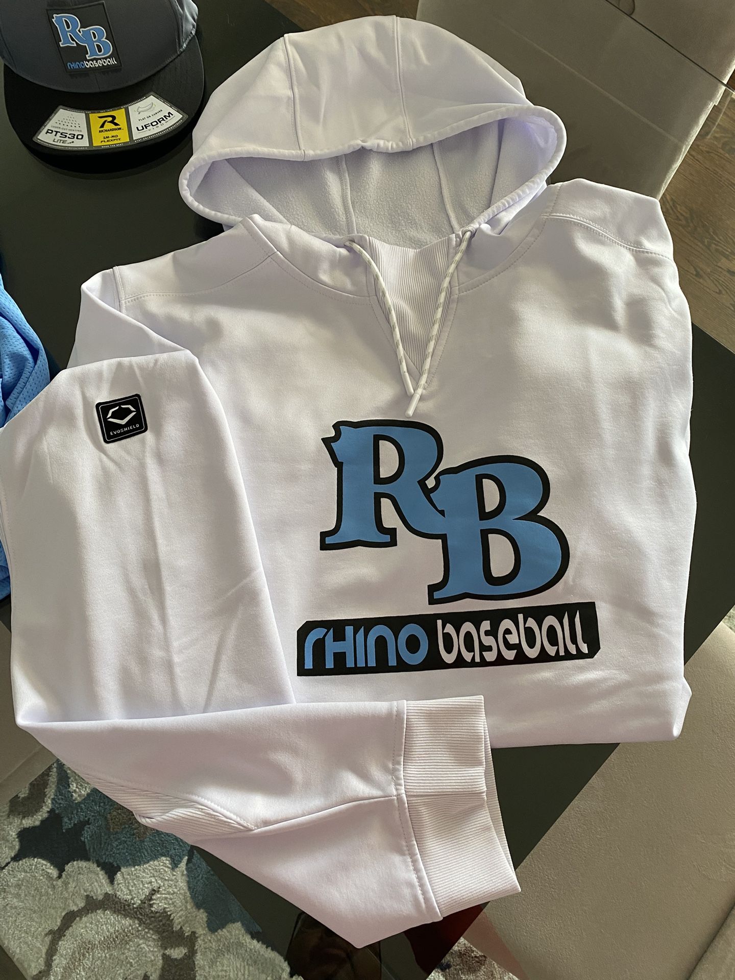 Rhino Baseball clothing Fitted Hats - small/medium - never worn $15each Baby blue XXL shorts - never worn $5 White Evo Shield hoodie XXL - worn once $30 Or all for $60 OBO