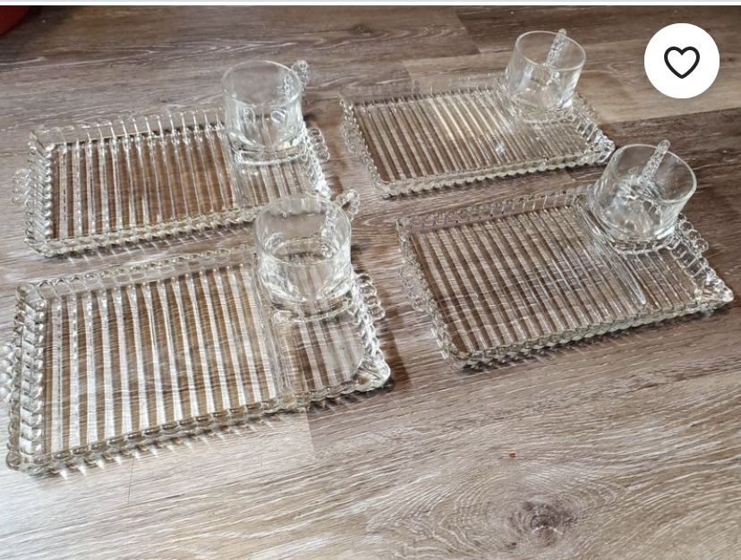 1940’s Beautiful “clear boopie beaded ribbed”vintage crystal 8 piece snack set which includes 8 cups & 8 vintage crystal plates In excellent condition.