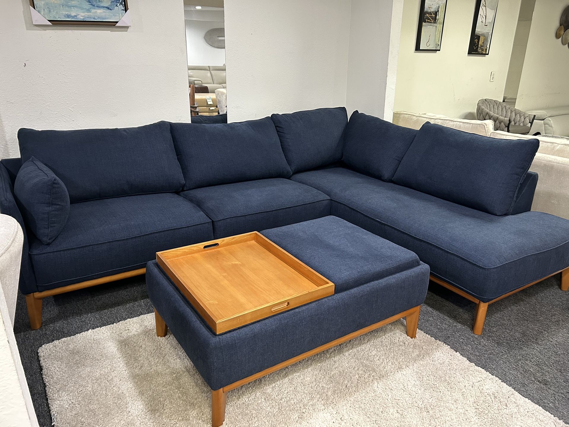 Sectional: 113"W x 86"D x 33"H $799 Ottoman: 45"W x 30"D x 18"H (sold separately) $250 Chair: 27"W x 35"D x 33"H $250 Retail price Sectional: $2,578 Ottoman: $469 Chair:$1,429 The Jollene is a mid century modern sectional with removable cushions and wooden legs that accentuates the mid century look and an ottoman with reversible tray that can either be used as an ottoman/footrest or a coffee table tray. The leather accent chair is the cherry on top complimenting the wood feature and tying the look together. Delivery available Financing available Store display item