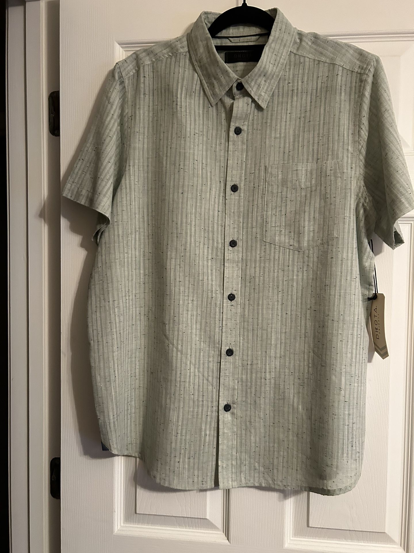 The Dakota Grizzly Ian Shirt is a short-sleeve button-down designed for comfort and style.Size Men's Large. Crafted from a blend of 55% linen and 45% cotton, it offers a lightweight and breathable fabric suitable for warm weather. The shirt features a subtle stripe pattern, adding a touch of sophistication to its casual design. Additional details include a hidden button-down collar for a clean look, a twill-taped collar seam for added durability, and a tonal chest pocket for convenience. Antiqued pewter buttons and an embossed sleeve clip enhance its classic appeal. The Ian Shirt seamlessly blends functionality with timeless style, making it suitable for both casual and semi-formal occasions. Chest measurements 22". Length of shirt 29"