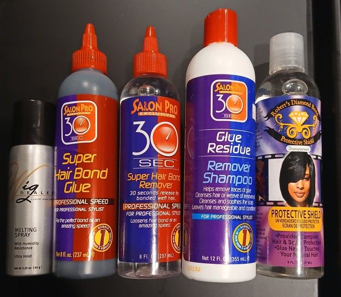 Save and buy everything you need to apply that next lace wig flawlessly and easily remove when it is time for the one after that! Includes: ~ Wig Dealer Melting Spray 2.25 oz ~ Salon Pro 30 Sec Super Hair Bond Glue 8 oz ~ Salon Pro 30 Sec Super Hair Bond Remover 8 oz ~ Salon Pro 30 Sec Glue Residue Remover Shampoo 12 oz ~ Robert's Diamond Bond Protective Shield 8 oz