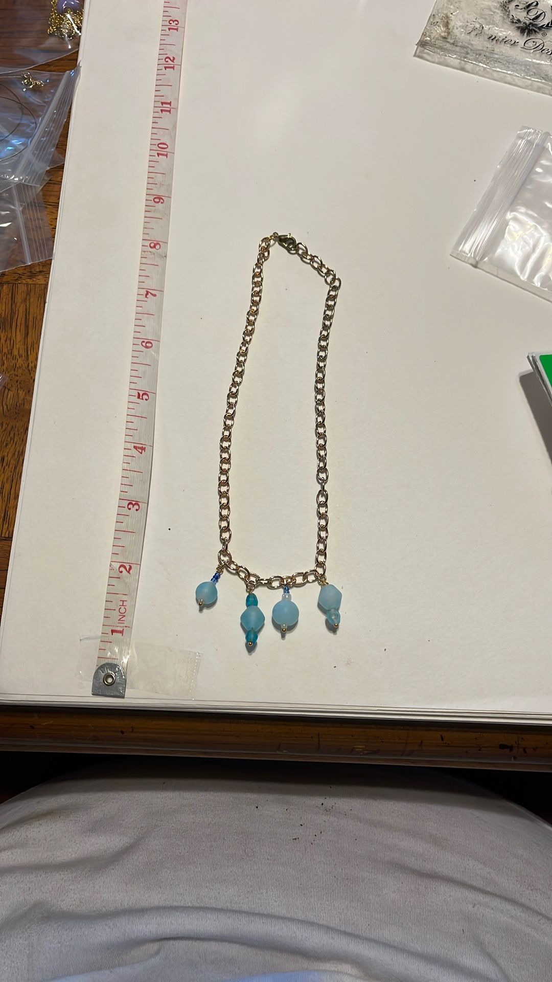 Assorted blue beads on gold chain