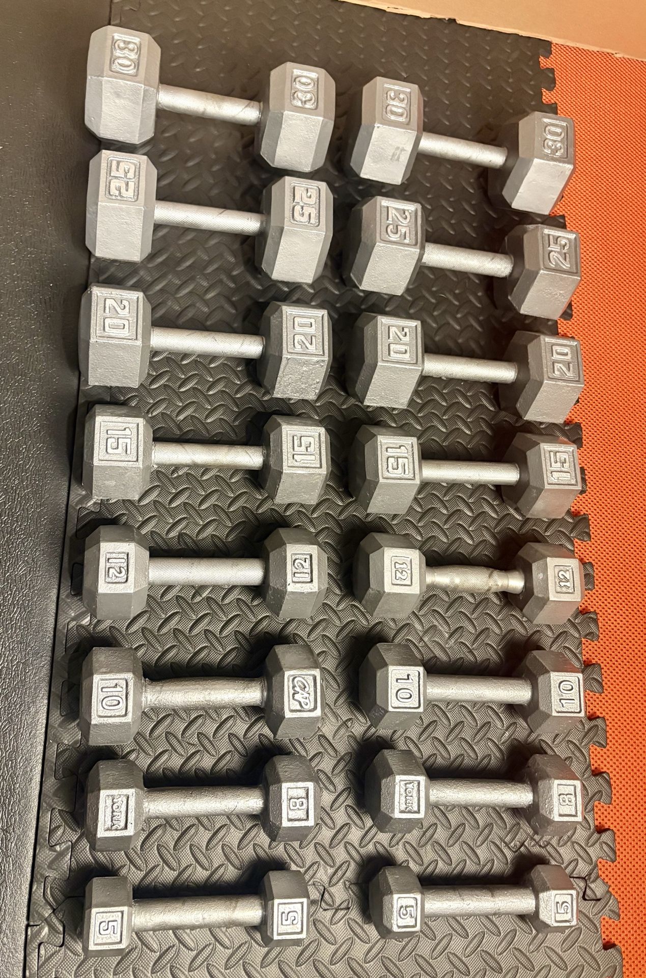 The Couple's Set... Cast Iron Hex Dumbbells: 5s, 8s, 10s, 12s, 15s, 20s, 25s and 30 pounders. Brute W= 250#