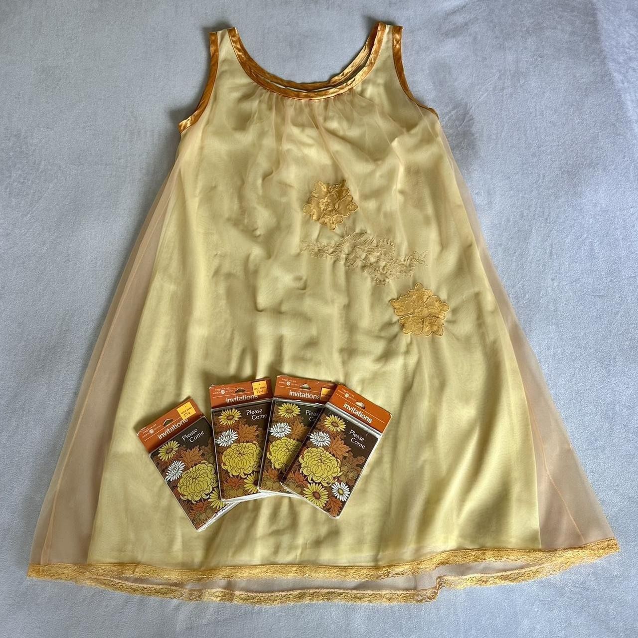 bonus vintage party invites excellent vintage condition/ couple tiny spots knee lining / have not washed / delicate ~ owner can no tags / medium approx 44” bust / 38” shoulder to hem