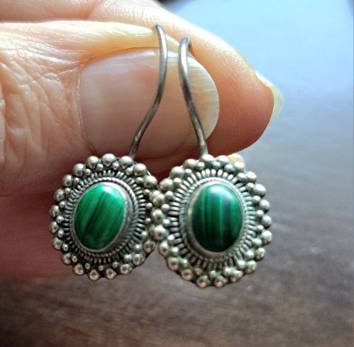 925 stamped oval green malachite hook earrings with a decorative silver beaded frame. Pick up at Urban Barn, 404 East Grand Avenue, Escondido.