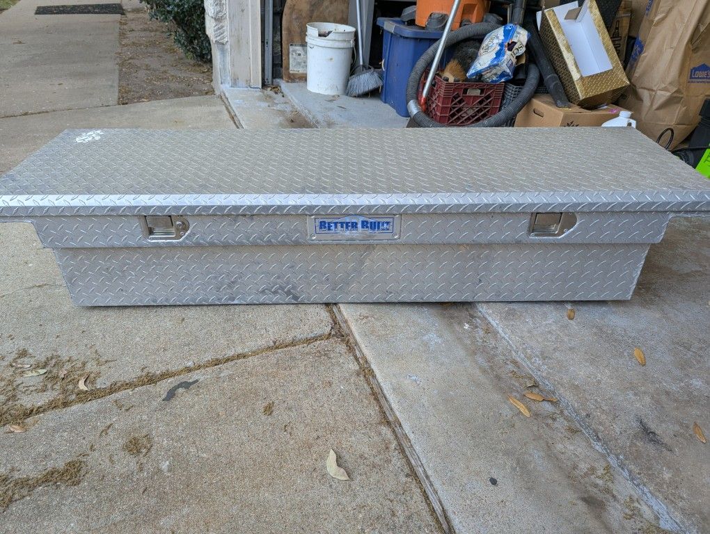 Tool box featuring a diamond tread pattern for durability and a locking paddle handle for security. Material: Lightweight yet durable aluminum. Design: Low-profile crossover design for enhanced visibility from the truck cab