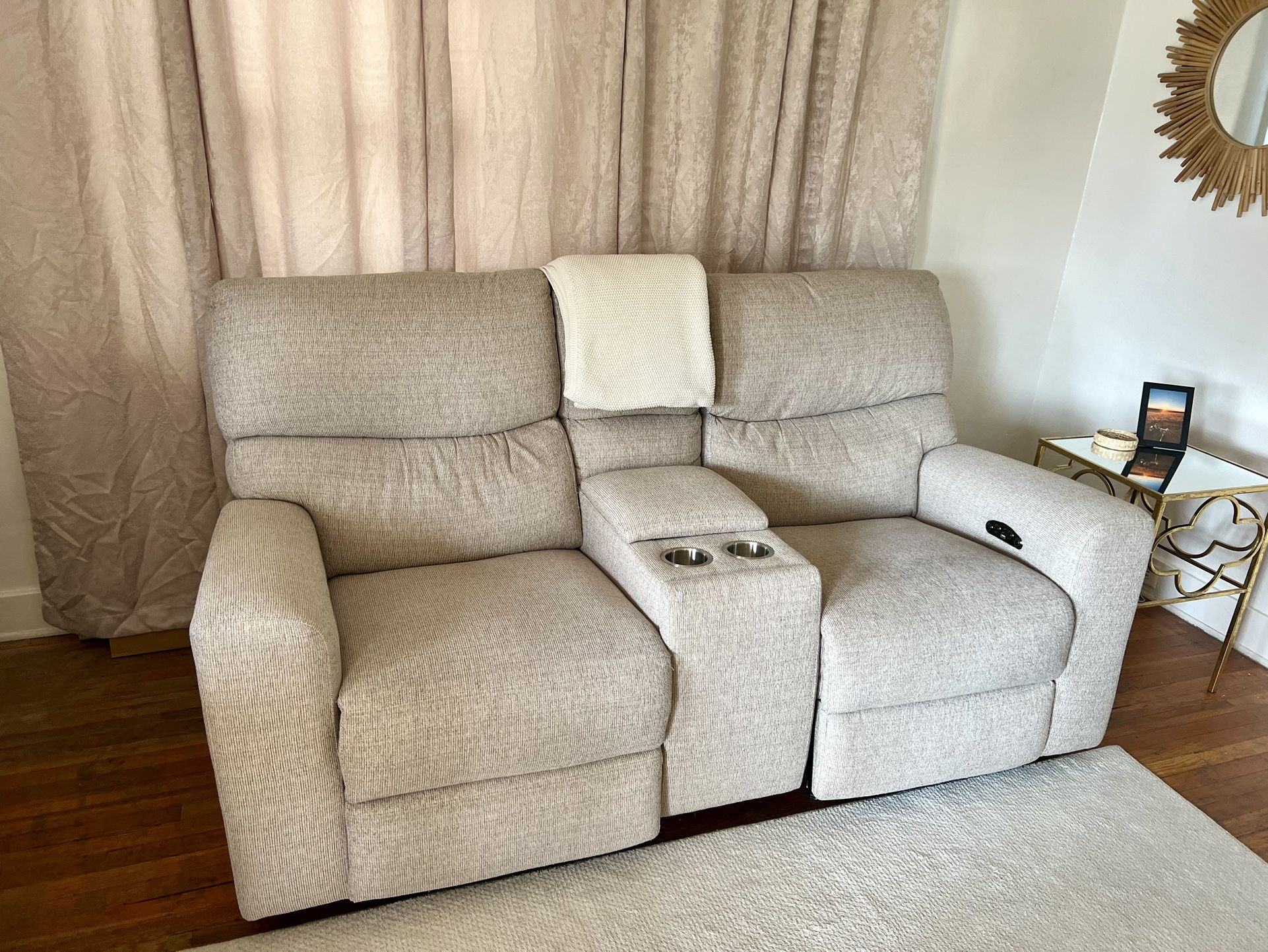 Electric reclining loveseat couch, beige 2 seater. In great condition, love this couch but need to sell. Only owned for one year, purchased from Bob’s Furniture for $1,200. Power reclining and headrest work perfectly. Head and foot rest can be adjusted separately. Has storage compartment and cup holders.