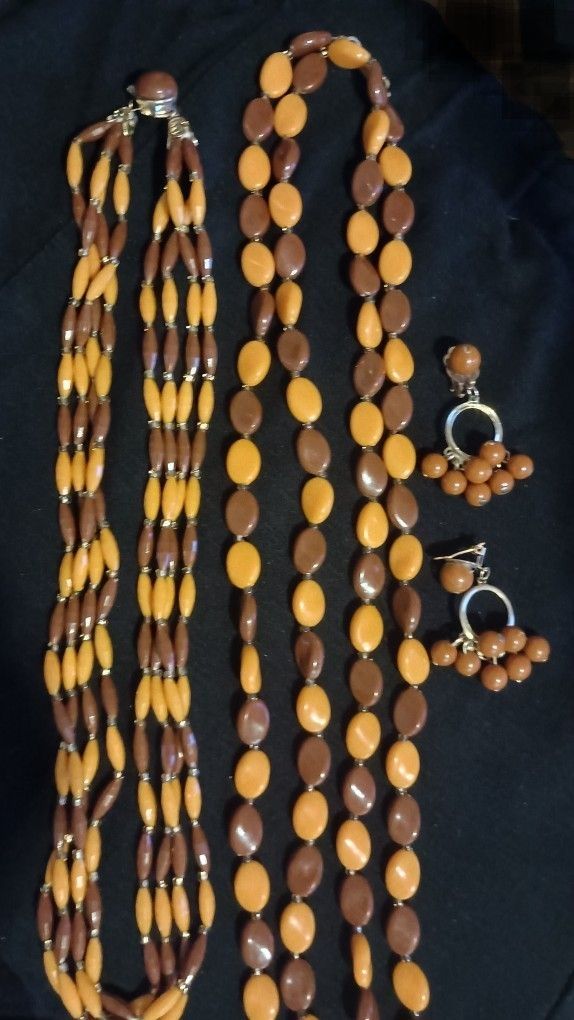 VINTAGE 1970's NECKLACES & EARRING SET PLASTIC BEADS MADE IN HONG KONG 22" NECKLACE THIN BEADS WITH ROUND CLASP STAMPED HONG KONG 28" NECKLACE WITH ROUND SHAPED BEADS FOLD OVER CLASP 1 1/2" LONG EARRINGS STAMPED HONG KONG #1820