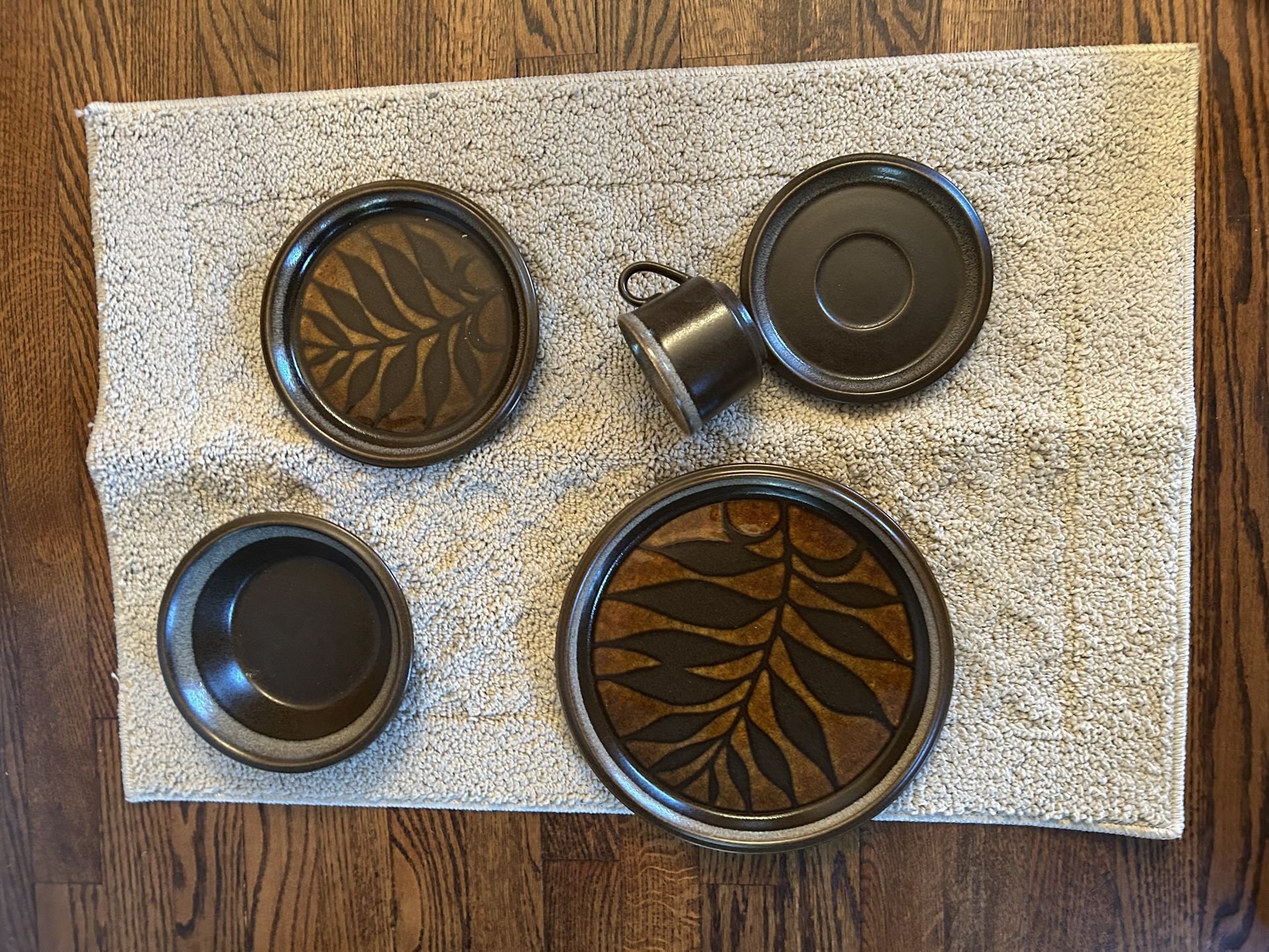 Dinnerware set includes 45 pieces 8 dinner plates 8 cups 8 saucers 8 soup bowls 8 salad/ dessert plates 1 large serving plate 1 large serving bowl 1 creamer 1 sugar bowl with 1 lid All new Never used Excellent condition