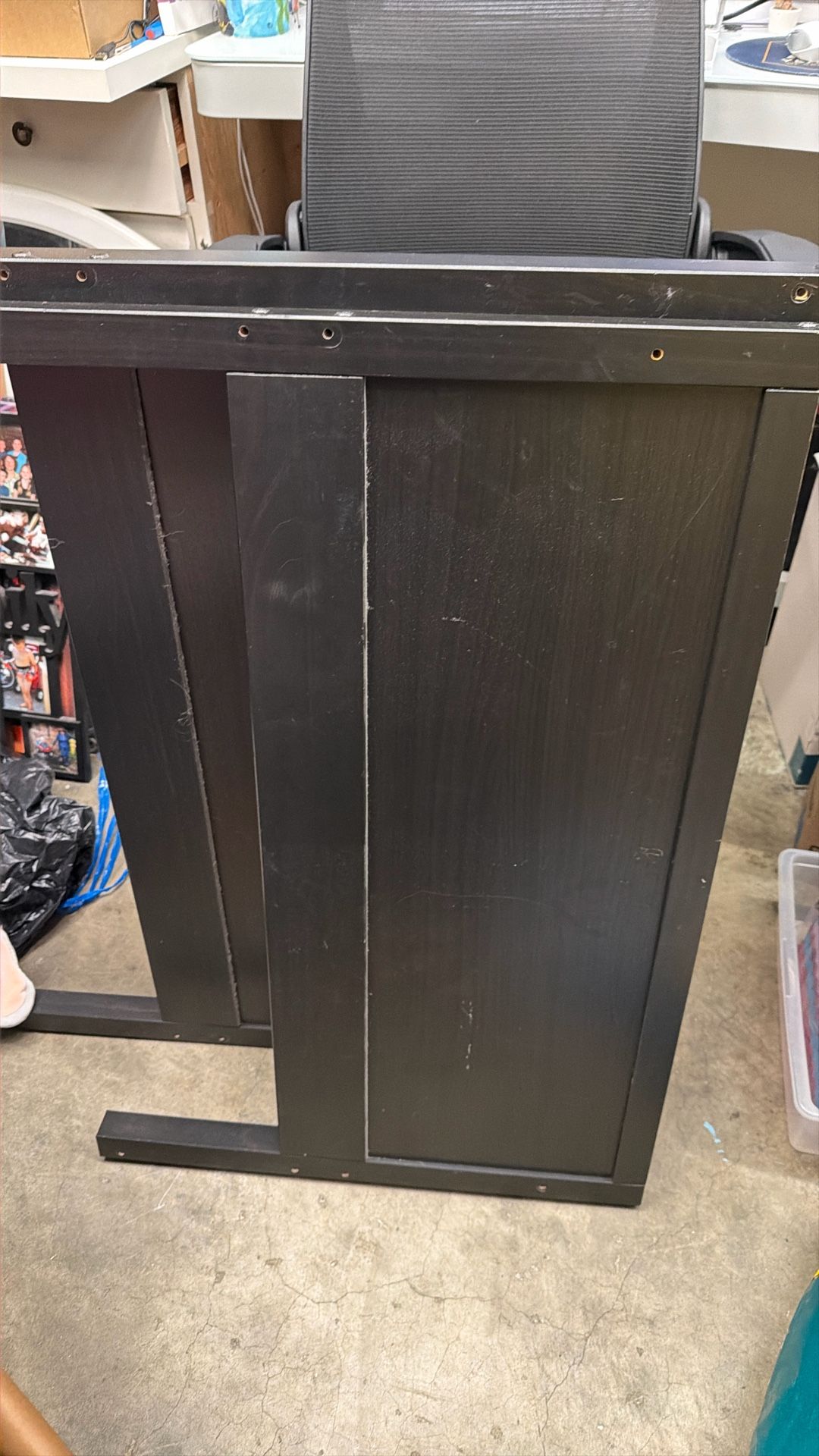 Twin bed frame used by my kiddo. Black/brown color and is solid- normal wear from as kid using it. Wooden slats- two of the wooden slats need replacing. All Hardware included.