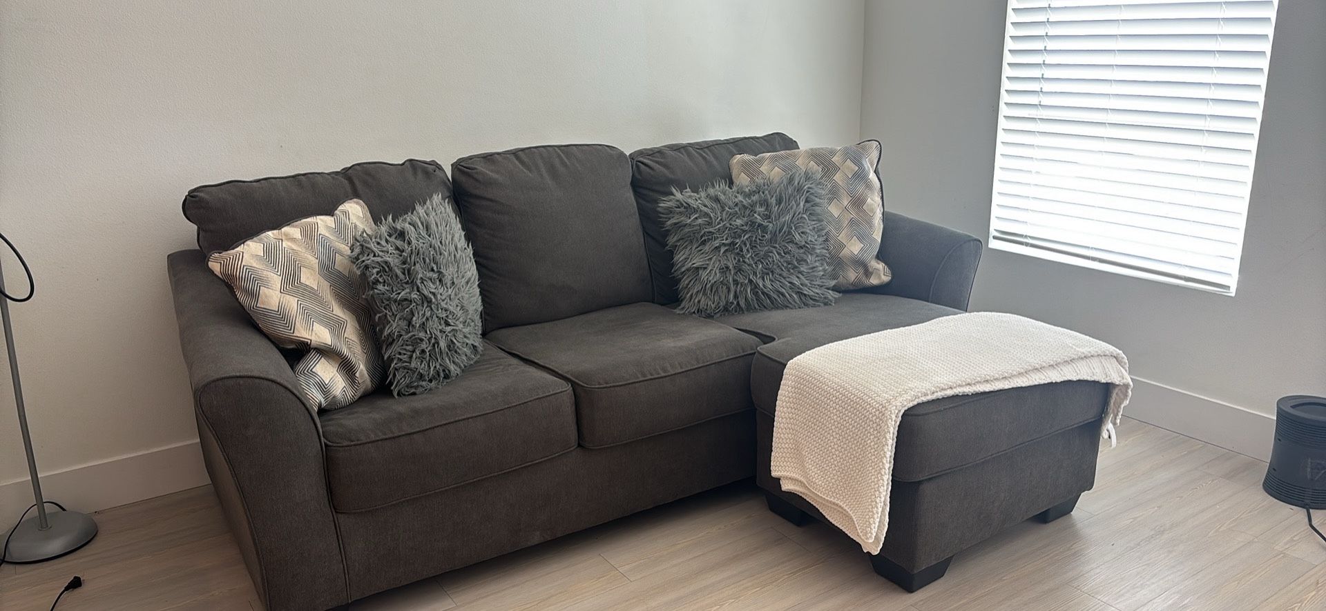 Dark Grey. Comes with pillows and blanket. Willing to negotiate price, no tears, no rips or stains. Smoke free and pet free environment. The sectional part detaches