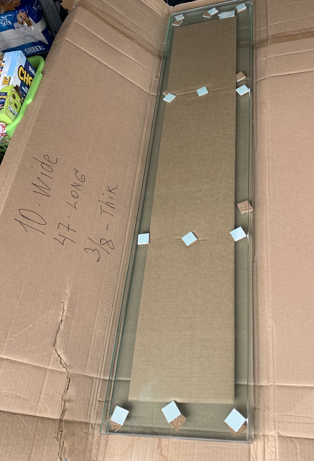 10” wide, 47” long, 3/8 thick. it’s nice thick strong sturdy glass brand new similar to home depot but cheeper and thicker stronger I have 12 pieces $25 a piece or take all for $300 all finished polished glass.