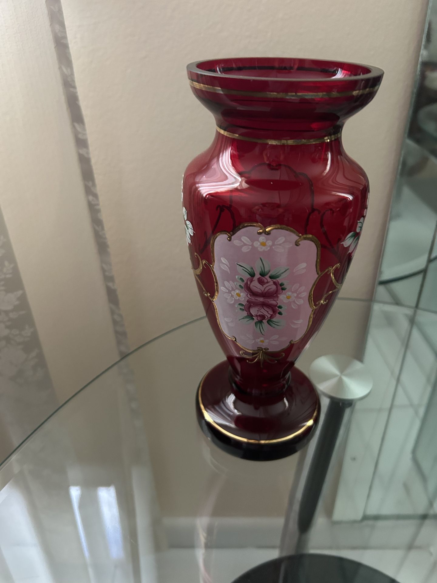 Vintage Vase. Bohemian BYTEP Art Glass Cranberry Red Hand Blown and Hand Painted Roses Vase Gold Trim. 9,5”H. Victorian Style.Very Rare.