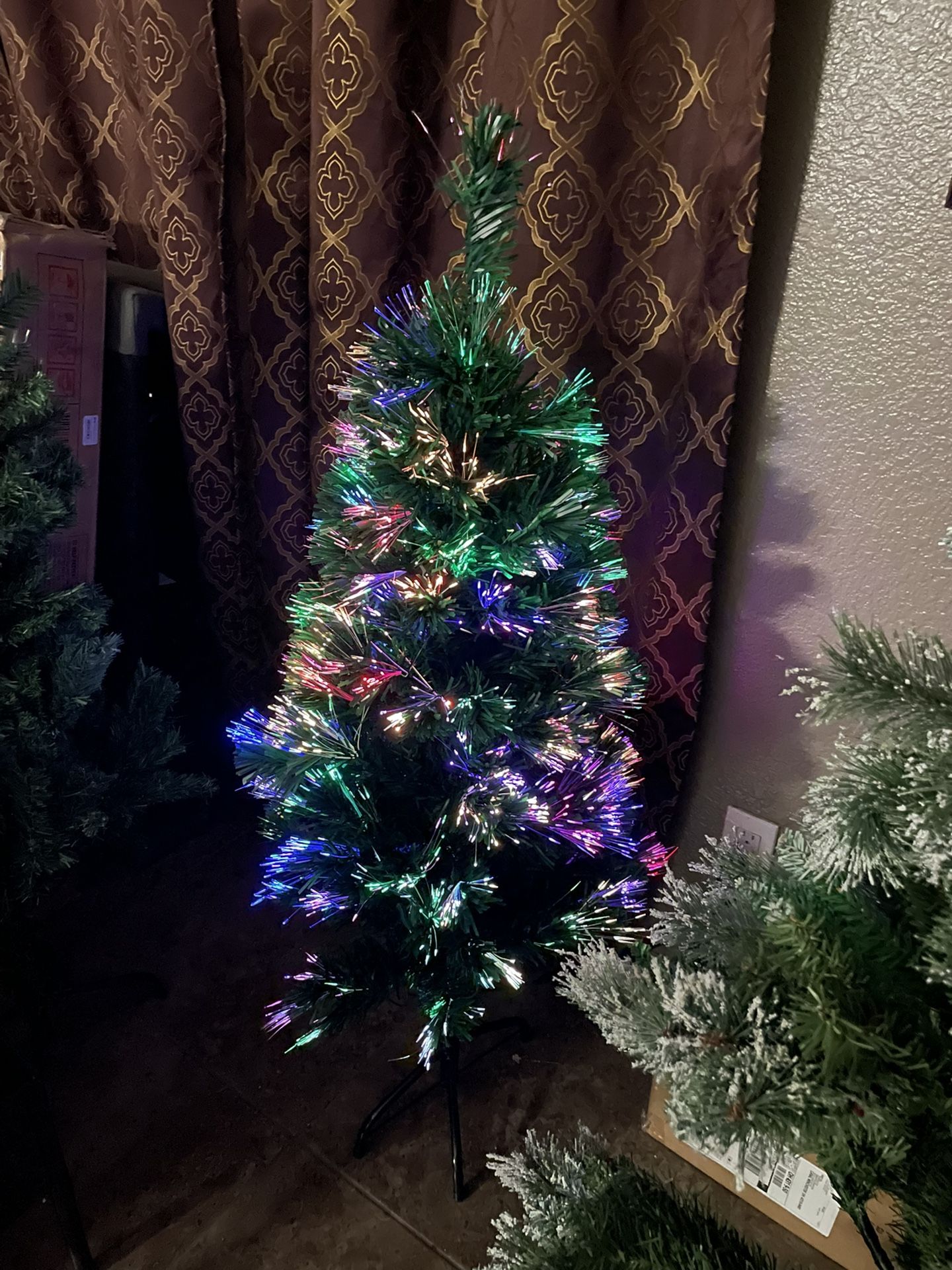 Brand new trees Only one comes with lights They’re short & small convenient for office , apartment, or room. 4-5 feet. TALL with metal stand