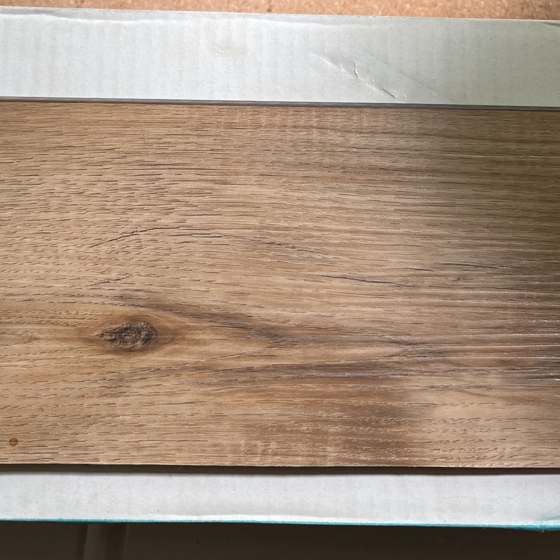 We had this installed in our entire house. It’s great stuff. This is the extra. Clicks together. Waterproof. Nice cork underside. Rustic oak design, with texture. 28 square per box. Two full boxes. The third box is missing like three pieces so it probably has about 20 square. So a total of about 75 square ft. This would be about $150 to purchase new.