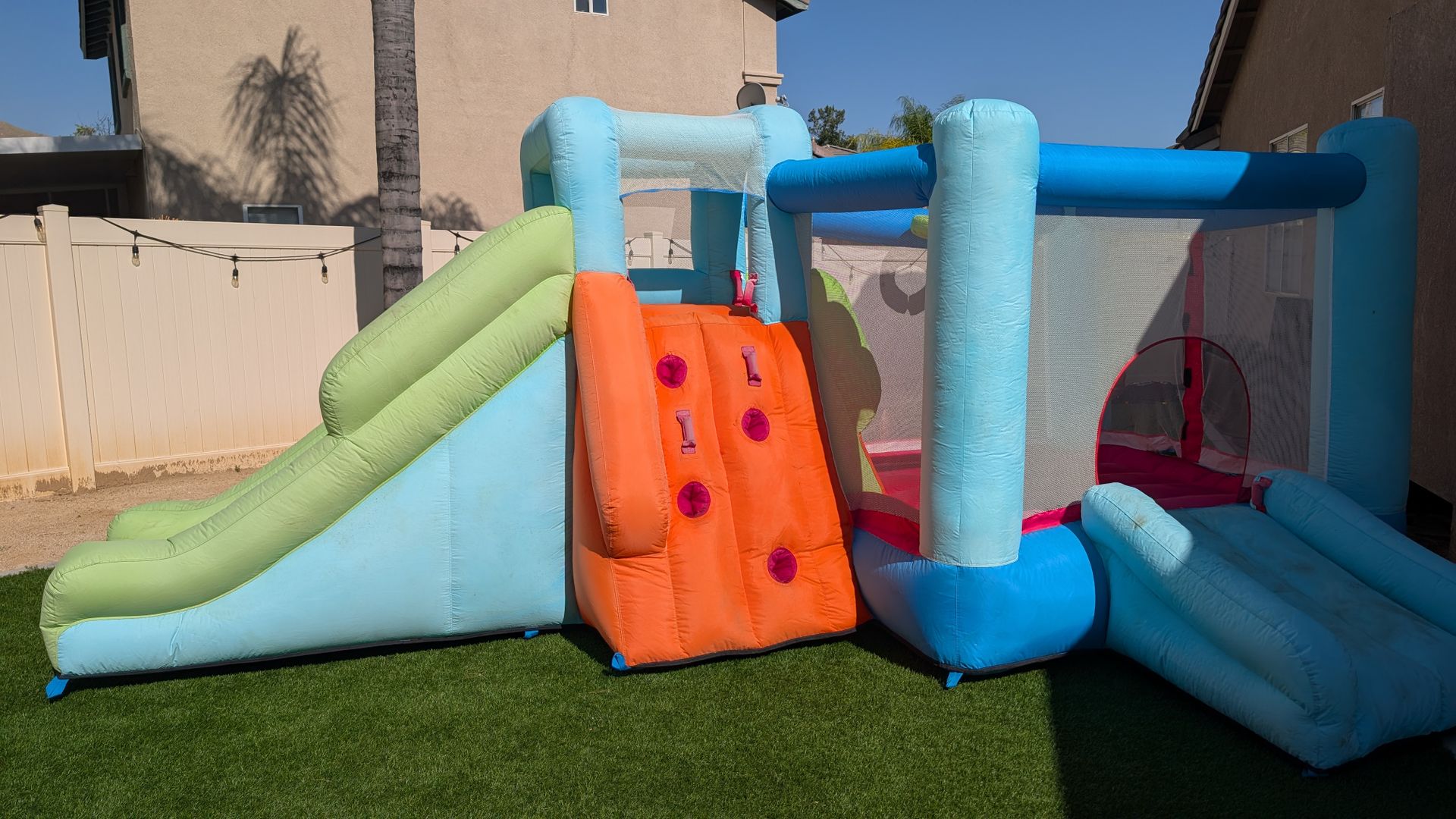 Jump house normal wear and tear and there is a hole it still inflates but took picture of hole you can patch it up and will work just great kids had lots of fun using it