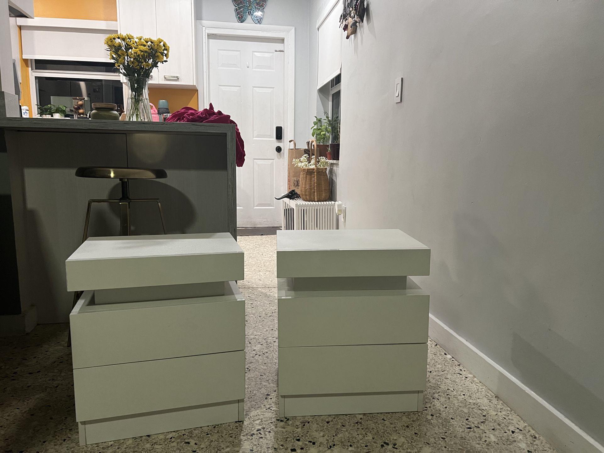 Clean, modern nightstands in excellent condition. Great for any bedroom setup. 2 drawers for everyday storage Lift-top compartment for hidden items (books, chargers, etc.) Sturdy and well-built Neutral white finish matches anything.
