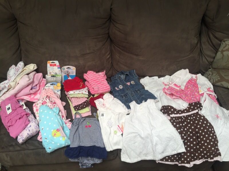 0-6 month girl clothes from smoke free & pet free home. Good condition & normal wear. 5 swaddler blankets,3 2-packs of pacifiers, nail clippers, 5 sleepers, 6 onesies, 3 rompers, 2 long sleeve onesies, 2 sweaters, 6 dresses. Baby gap, Calvin Klein, Carters, Gymboree brands. Some with tags still on.