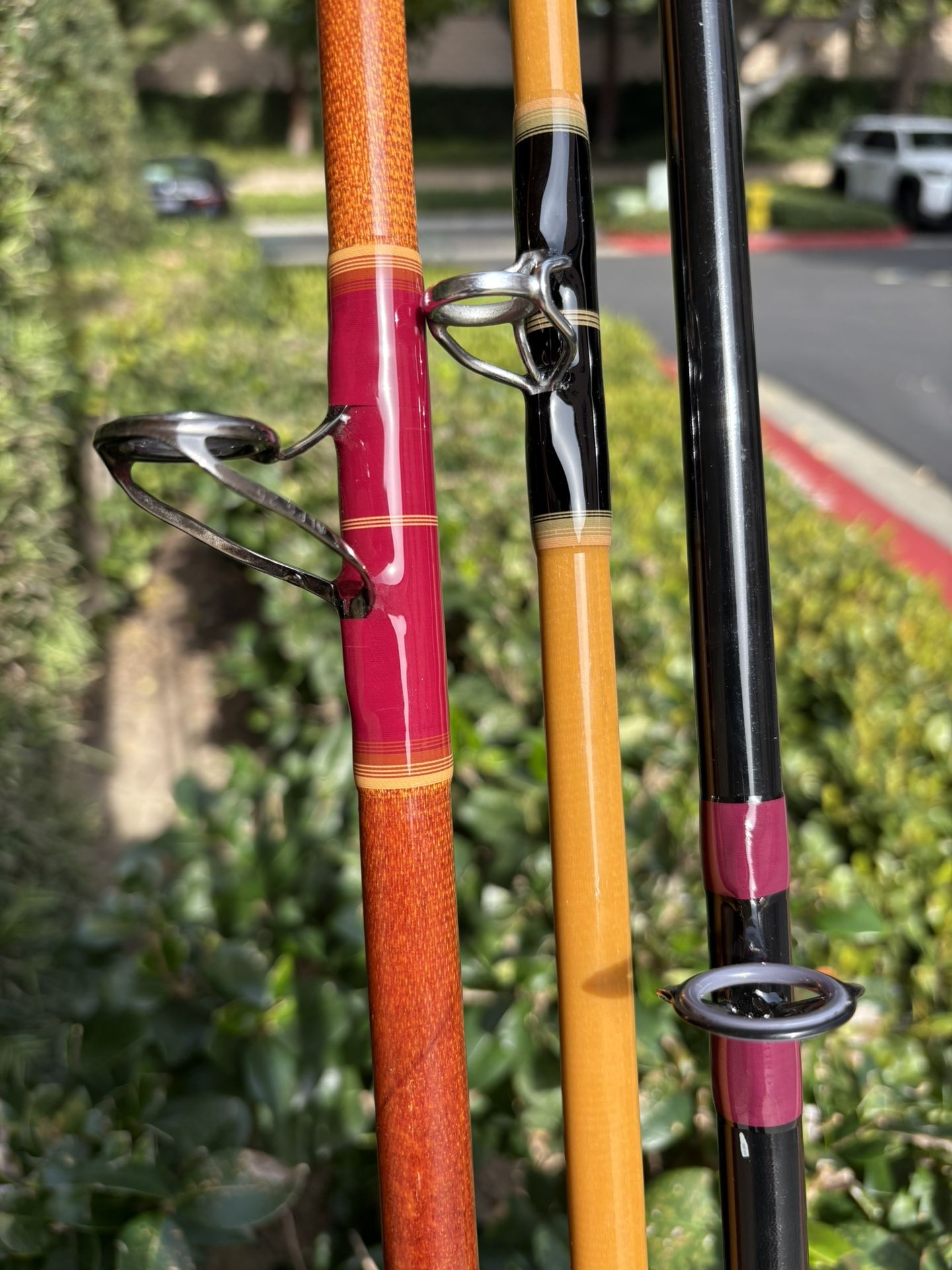 I have three brand new custom rods I wrapped. From left to right Thick walled 9’ conolon, sweet 30# rod. Alps guides, tuna cord and wrapped in old school colors. Asking 450$ Sabre 610H, rare one that you don’t see often. Full length at 7’3”. Amazing 40# rod. Asking 350$ Varmac 270-8, 8’ 20-40# rod. Fuji guides Asking 160$ Located in Irvine Willing to trade for blanks or Shimano talicas