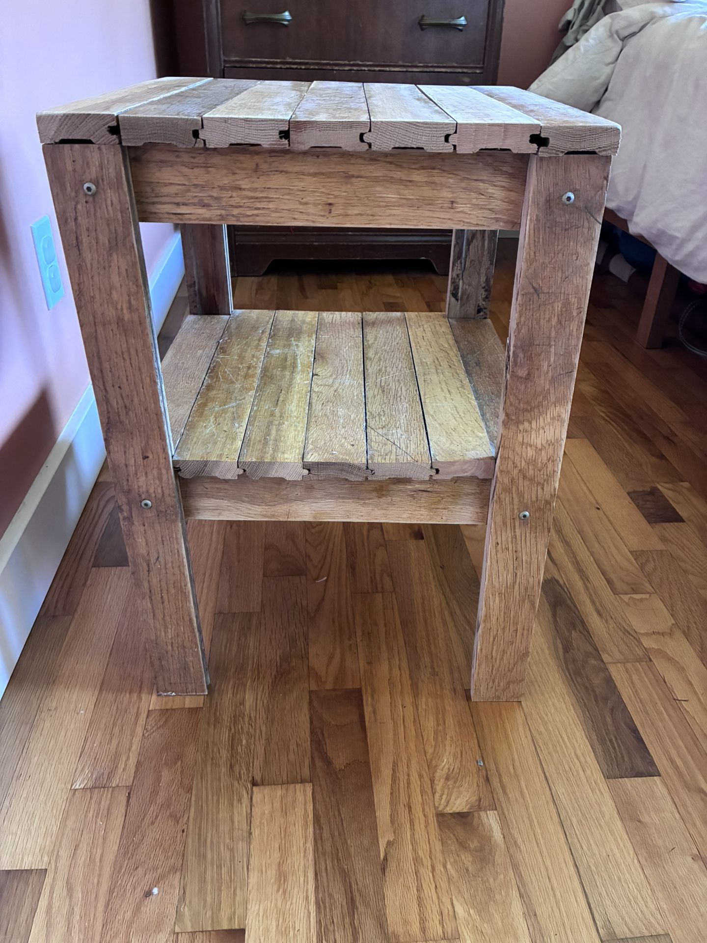 My dad made this from Oak flooring from my elementary school. It’s 16 in x 16 in top & shelf and 22 3/4 in high.