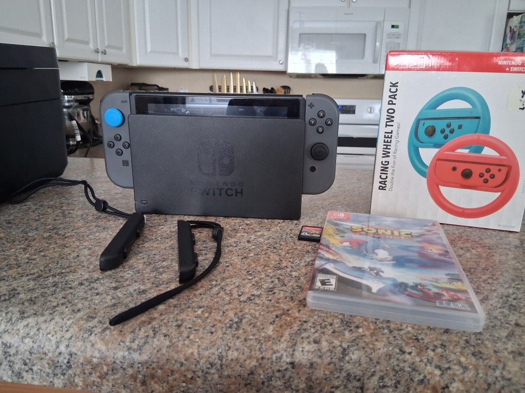 Lightly used Nintendo Switch in great condition. Comes with 2 games (Sonic and Pac-Man), a steering wheel attachment for driving games, memory card, Joy-Con attachments, and a screen protector already on the console. Only selling because we upgraded to a newer one! WILLING TO NEGOTIATE