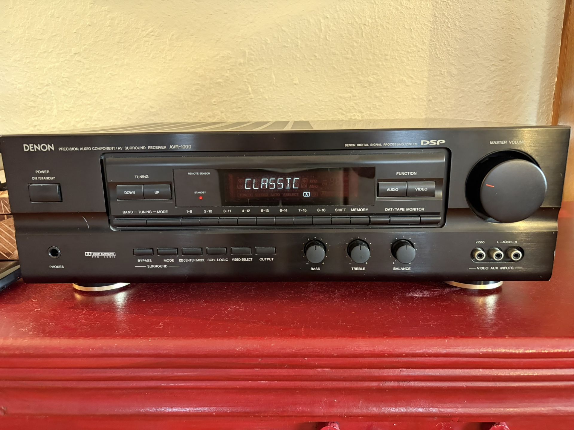 The Denon AVR-1000 is a vintage AV surround stereo receiver that was manufactured around 1994. It is known for its solid build quality, Japanese manufacturing, and inclusion of a phono input for turntables. Works like new! Remote missing battery cover.