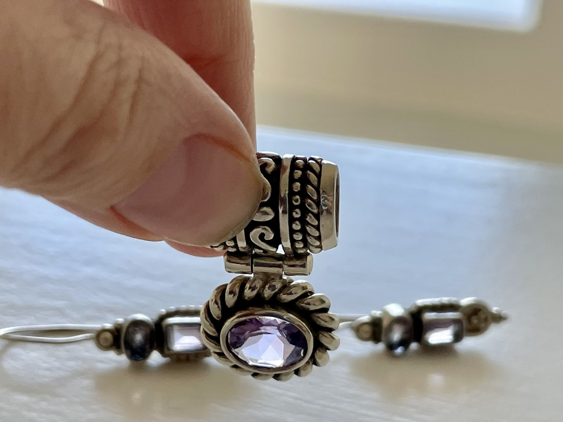 I’m not sure what the gemstones are, possibly amethysts. There’s a 925 marking on the back. The set is very old, pre-owned, but is in a perfect condition. I have gently cleaned it, so it shines like new!