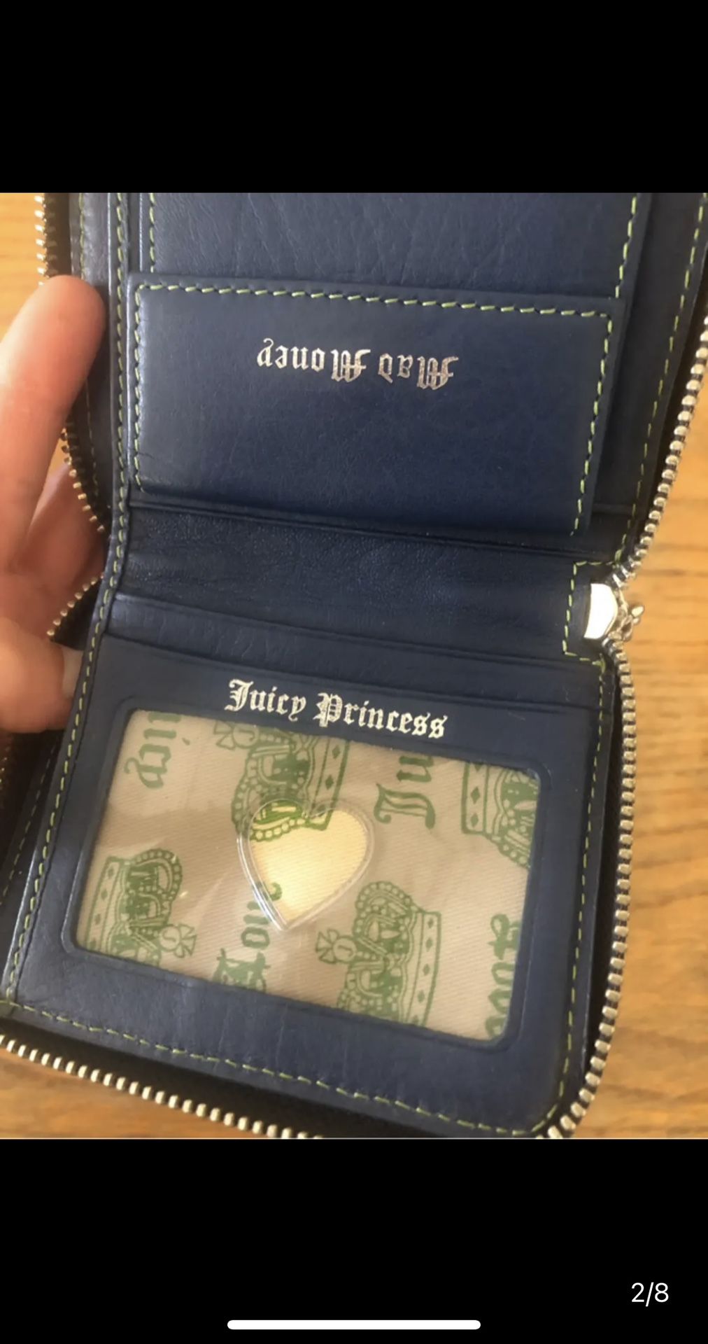 High desert south Adelanto pick up- Juicy Couture Y2K Vintage Design Thick Green Suede Material zipper wallet is all new never used inside. Nice Teal Navy Blue Leather trim & green logo print material inside sections w/ change snap pocket. Perfect clean leather trim dollar bill long section has pink tag. Little scuff fray suede material corner in last pic. says “I Love Juicy” & other side has leather heart is great. Silver coloring zipper is coming off on chain has some scuffs mainly on 1 side. Nice everywhere else never used inside, $25.
