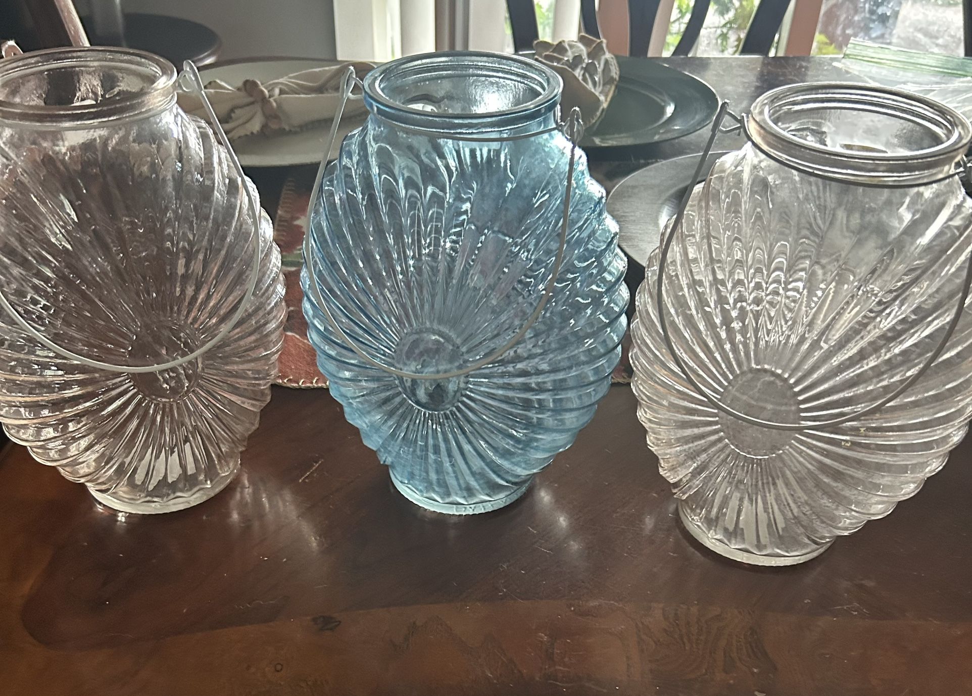 Brand new decorative vases with white metal handles 1 Light blue , 2 light pink 3 vases for $25 Or $10 each 7”W 9.5”H Pick up only