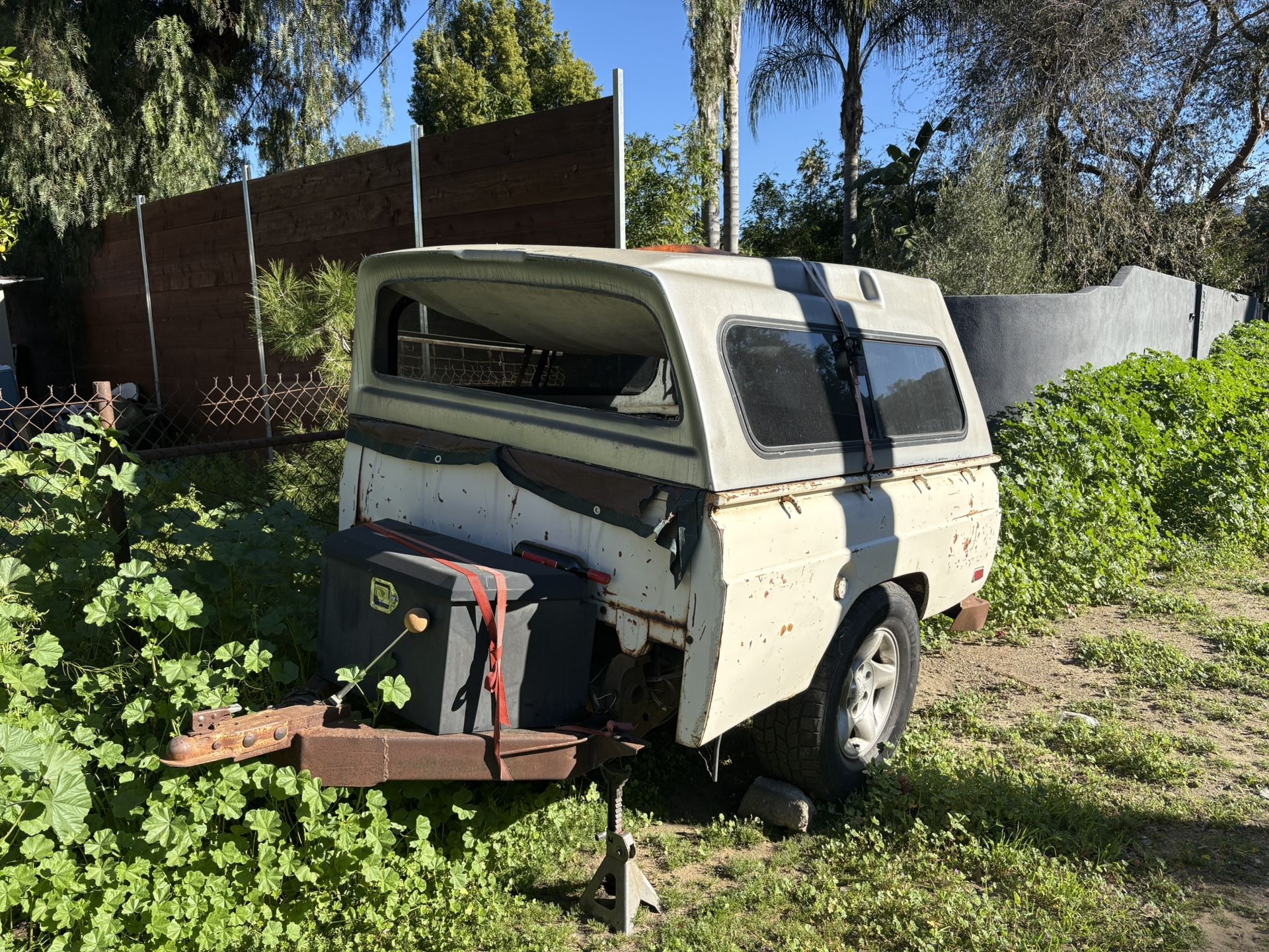 1970s Ford truck bed trailer with Camper Shell and lockbox in the front.