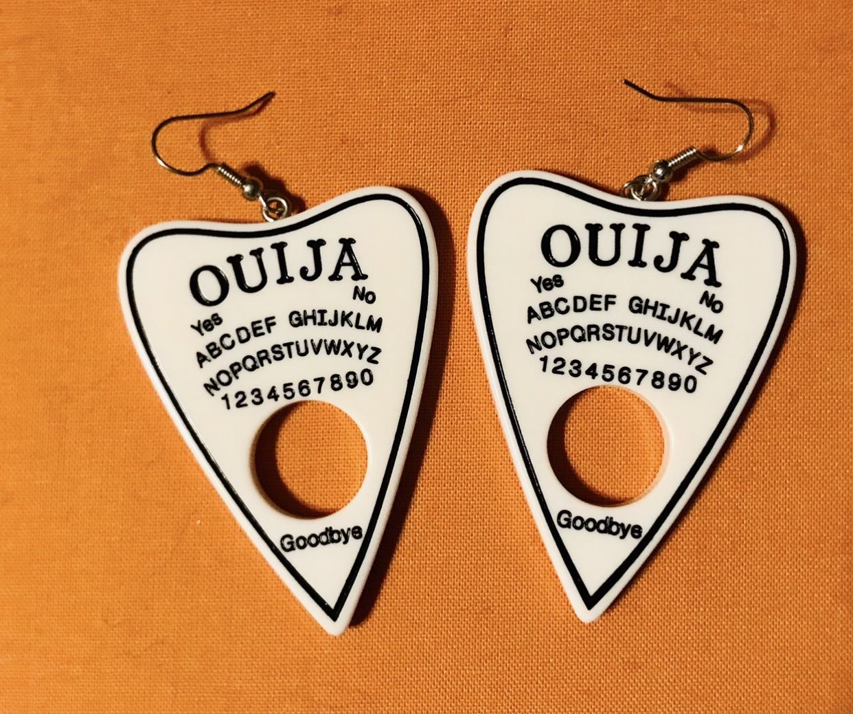 Ouija board planchette earrings for Halloween.