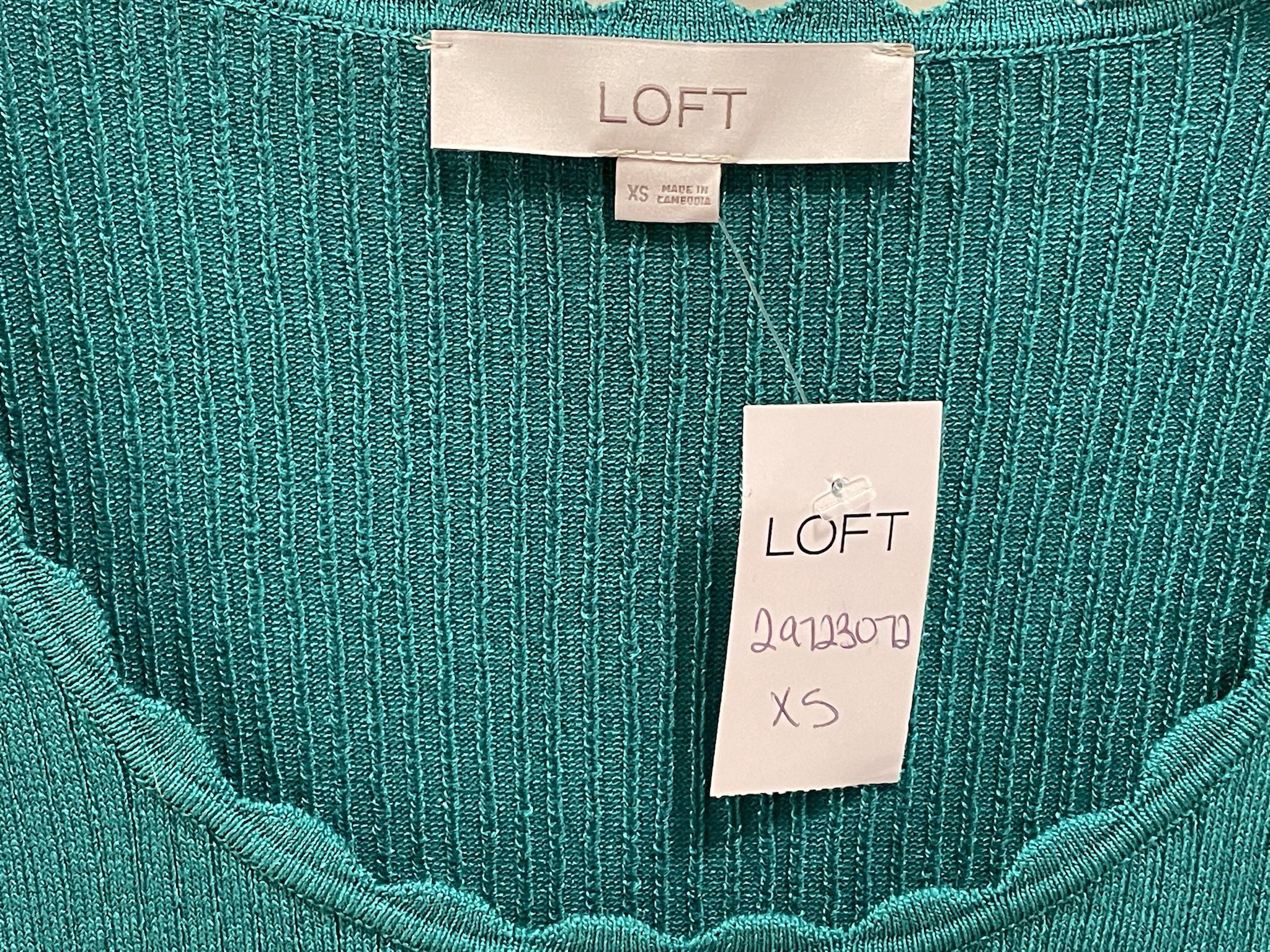 New Loft green sweater in size extra small (S) with a sculpted neckline and a bit of shimmer. Sweater is new with tags selling for $10.00