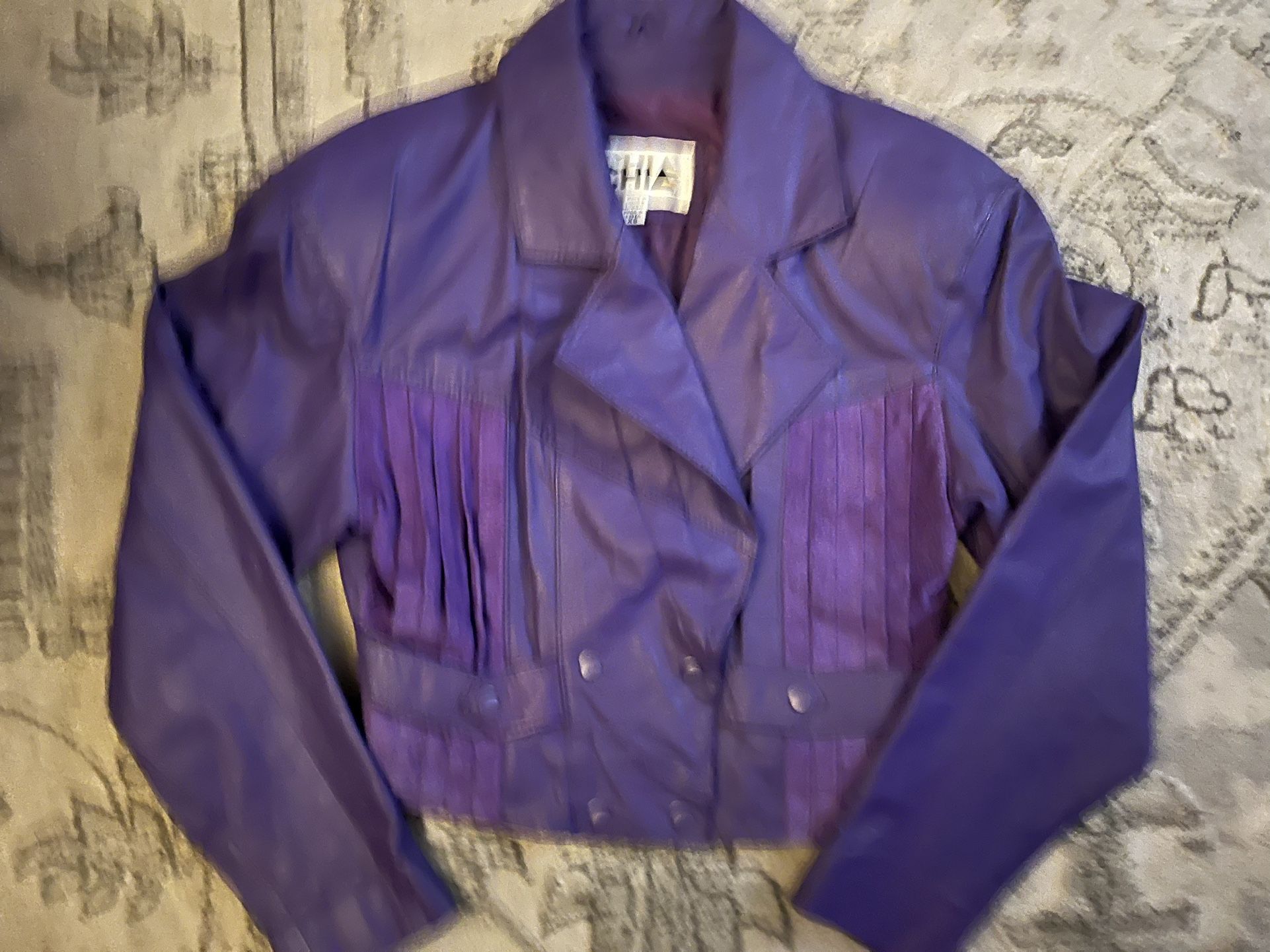 Soft leather, crop style, button-up front and back belt, soft suede in front. No rips or snags, on jacket or lining.